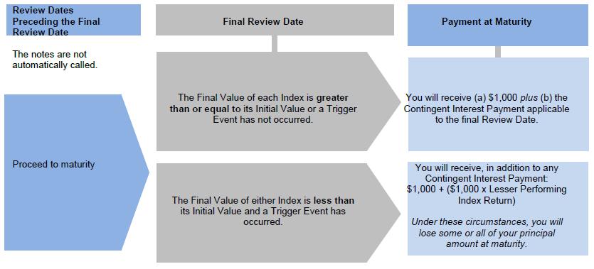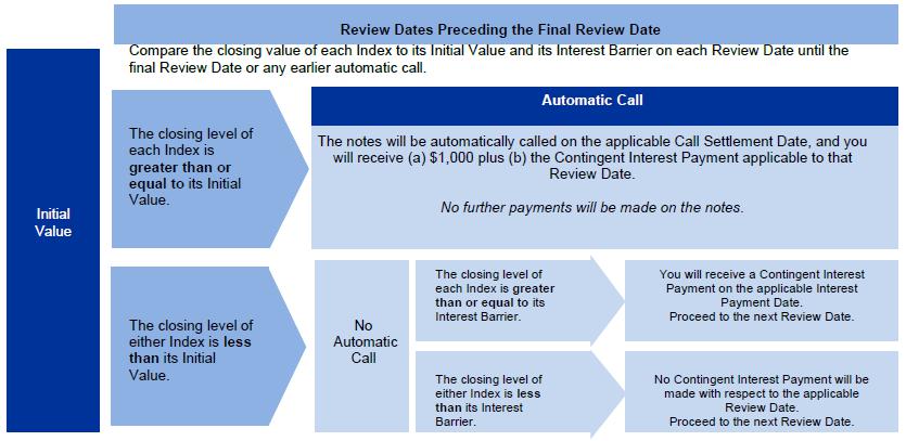| ● | The notes will be automatically called if the closing level of each Index on any Review Date (other than the final Review Date) is greater than or equal to its Initial Value. |