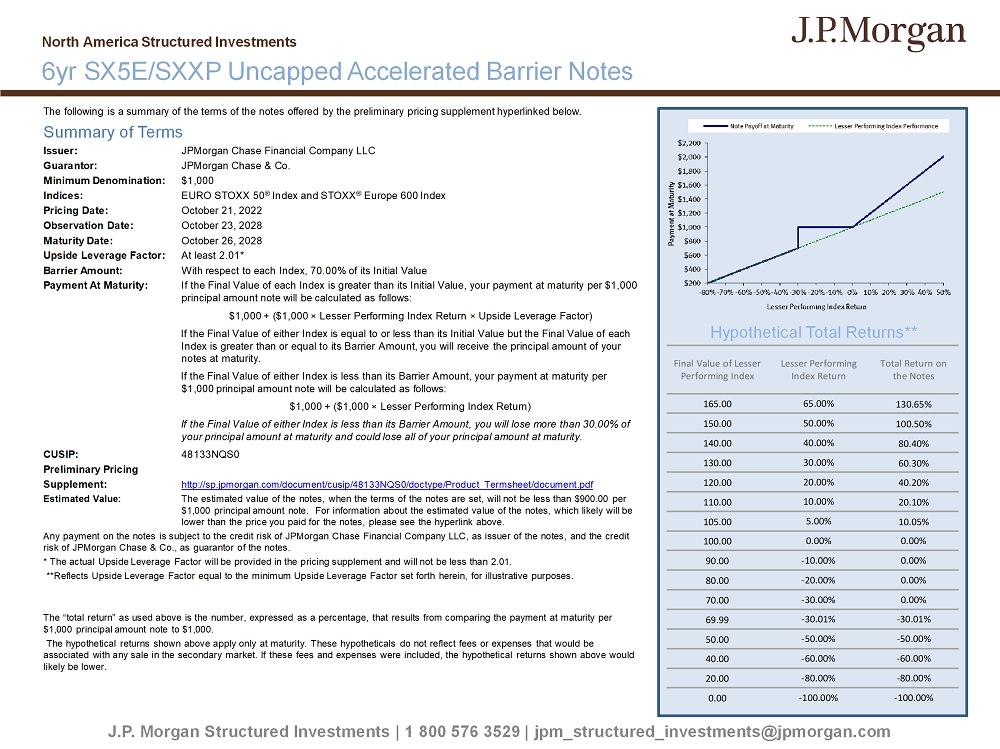 The following is a summary of the terms of the notes offered by the preliminary pricing supplement hyperlinked below. Summary of Terms Issuer: JPMorgan Chase Financial Company LLC Guarantor: JPMorgan Chase & Co. Minimum Denomination: $1,000 Indices: EURO STOXX 50 ® Index and STOXX ® Europe 600 Index Pricing Date: October 21, 2022 Observation Date: October 23, 2028 Maturity Date: October 26, 2028 Upside Leverage Factor: At least 2.01* Barrier Amount: With respect to each Index, 7 0.00 % of its Initial Value Payment At Maturity: If the Final Value of each Index is greater than its Initial Value, your payment at maturity per $1,000 principal amount note will be calculated as follows: $1,000 + ($1,000 î Lesser Performing Index Return î Upside Leverage Factor) If the Final Value of either Index is equal to or less than its Initial Value but the Final Value of each Index is greater than or equal to its Barrier Amount, you will receive the principal amount of your notes at maturity. If the Final Value of either Index is less than its Barrier Amount, your payment at maturity per $1,000 principal amount note will be calculated as follows: $1,000 + ($ 1,000 î Lesser Performing Index Return) If the Final Value of either Index is less than its Barrier Amount, you will lose more than 30.00 % of your principal amount at maturity and could lose all of your principal amount at maturity. CUSIP: 48133NQS0 Preliminary Pricing Supplement: http://sp.jpmorgan.com/document/cusip/48133NQS0/doctype/Product_Termsheet/document.pdf Estimated Value: The estimated value of the notes, when the terms of the notes are set, will not be less than $900.00 per $1,000 principal amount note. For information about the estimated value of the notes, which likely will be lower than the price you paid for the notes, please see the hyperlink above . Any payment on the notes is subject to the credit risk of JPMorgan Chase Financial Company LLC, as issuer of the notes, and the credit risk of JPMorgan Chase & Co., as guarantor of the notes . * The actual Upside Leverage Factor will be provided in the pricing supplement and will not be less than 2.01. **Reflects Upside Leverage Factor equal to the minimum Upside Leverage Factor set forth herein, for illustrative purposes. The “total return” as used above is the number, expressed as a percentage, that results from comparing the payment at maturity pe r $1,000 principal amount note to $1,000. The hypothetical returns shown above apply only at maturity. These hypotheticals do not reflect fees or expenses that would be associated with any sale in the secondary market. If these fees and expenses were included, the hypothetical returns shown above would likely be lower. J.P. Morgan Structured Investments | 1 800 576 3529 | jpm_structured_investments@jpmorgan.com Final Value of Lesser Performing Index Lesser Performing Index Return Total Return on the Notes 165.00 65.00% 130.65% 150.00 50.00% 100.50% 140.00 40.00% 80.40% 130.00 30.00% 60.30% 120.00 20.00% 40.20% 110.00 10.00% 20.10% 105.00 5.00% 10.05% 100.00 0.00% 0.00% 90.00 - 10.00% 0.00% 80.00 - 20.00% 0.00% 70.00 - 30.00% 0.00% 69.99 - 30.01% - 30.01% 50.00 - 50.00% - 50.00% 40.00 - 60.00% - 60.00% 20.00 - 80.00% - 80.00% 0.00 - 100.00% - 100.00% 6 yr SX5E / SXXP Uncapped Accelerated Barrier Notes North America Structured Investments Hypothetical Total Returns**