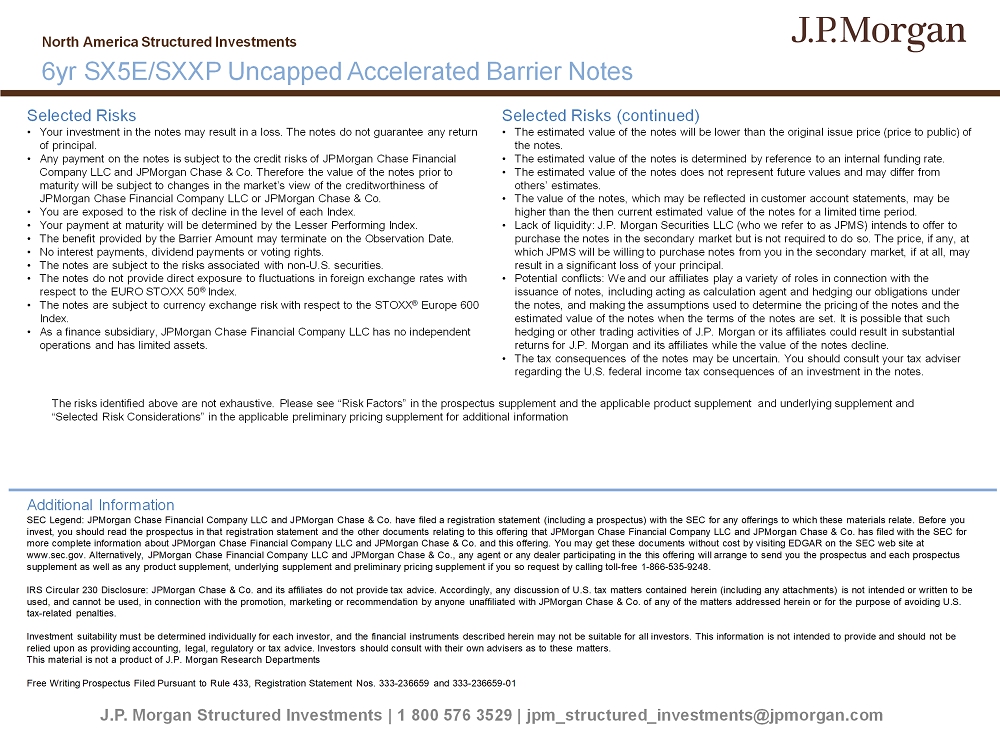 J.P. Morgan Structured Investments | 1 800 576 3529 | jpm_structured_investments@jpmorgan.com Selected Risks • Your investment in the notes may result in a loss. The notes do not guarantee any return of principal. • Any payment on the notes is subject to the credit risks of JPMorgan Chase Financial Company LLC and JPMorgan Chase & Co. Therefore the value of the notes prior to maturity will be subject to changes in the market’s view of the creditworthiness of JPMorgan Chase Financial Company LLC or JPMorgan Chase & Co. • You are exposed to the risk of decline in the level of each Index . • Your payment at maturity will be determined by the Lesser Performing Index. • The benefit provided b y the Barrier Amount may terminate on the Observation Date. • No interest payments, dividend payments or voting rights. • The notes are subject to the risks associated with non - U.S. securities. • The notes do not provide direct exposure to fluctuations in foreign exchange rates with respect to the EURO STOXX 50 ® Index. • The notes are subject to currency exchange risk with respect to the STOXX ® Europe 600 Index . • As a finance subsidiary, JPMorgan Chase Financial Company LLC has no independent operations and has limited assets. Selected Risks (continued) • The estimated value of the notes will be lower than the original issue price (price to public) of the notes. • The estimated value of the notes is determined by reference to an internal funding rate. • The estimated value of the notes does not represent future values and may differ from others’ estimates. • The value of the notes, which may be reflected in customer account statements, may be higher than the then current estimated value of the notes for a limited time period. • Lack of liquidity: J.P. Morgan Securities LLC (who we refer to as JPMS ) intends to offer to purchase the notes in the secondary market but is not required to do so. The price, if any, at which JPMS will be willing to purchase notes from you in the secondary market, if at all, may result in a significant loss of your principal. • Potential conflicts: We and our affiliates play a variety of roles in connection with the issuance of notes, including acting as calculation agent and hedging our obligations under the notes, and making the assumptions used to determine the pricing of the notes and the estimated value of the notes when the terms of the notes are set. It is possible that such hedging or other trading activities of J.P. Morgan or its affiliates could result in substantial returns for J.P. Morgan and its affiliates while the value of the notes decline. • The tax consequences of the notes may be uncertain. You should consult your tax adviser regarding the U.S. federal income tax consequences of an investment in the notes . . Additional Information SEC Legend: JPMorgan Chase Financial Company LLC and JPMorgan Chase & Co. have filed a registration statement (including a pr osp ectus) with the SEC for any offerings to which these materials relate. Before you invest, you should read the prospectus in that registration statement and the other documents relating to this offering that JPM organ Chase Financial Company LLC and JPMorgan Chase & Co. has filed with the SEC for more complete information about JPMorgan Chase Financial Company LLC and JPMorgan Chase & Co. and this offering. You may get the se documents without cost by visiting EDGAR on the SEC web site at www.sec.gov. Alternatively, JPMorgan Chase Financial Company LLC and JPMorgan Chase & Co., any agent or any dealer participating in the this offering will arrange to send you the pr ospectus and each prospectus supplement as well as any product supplement, underlying supplement and preliminary pricing supplement if you so request by calling toll - free 1 - 866 - 535 - 9248. IRS Circular 230 Disclosure: JPMorgan Chase & Co. and its affiliates do not provide tax advice. Accordingly, any discussion o f U .S. tax matters contained herein (including any attachments) is not intended or written to be used, and cannot be used, in connection with the promotion, marketing or recommendation by anyone unaffiliated with JPMorgan Cha se & Co. of any of the matters addressed herein or for the purpose of avoiding U.S. tax - related penalties. Investment suitability must be determined individually for each investor, and the financial instruments described herein may not be suitable for all investors. This information is not intended to provide and should not be relied upon as providing accounting, legal, regulatory or tax advice. Investors should consult with their own advisers as to these matters. This material is not a product of J.P. Morgan Research Departments Free Writing Prospectus Filed Pursuant to Rule 433, Registration Statement Nos. 333 - 236659 and 333 - 236659 - 01 North America Structured Investments 6 yr SX5E / SXXP Uncapped Accelerated Barrier Notes The risks identified above are not exhaustive. Please see “Risk Factors” in the prospectus supplement and the applicable product supplement and underlying supplement and “Selected Risk Considerations” in the applicable preliminary pricing supplement for additional information