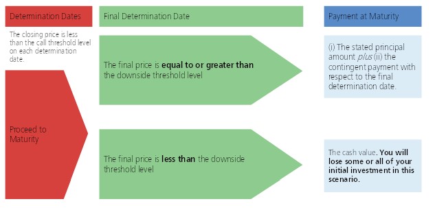 If, on any determination date (other than the final determination date), the closing price of the underlying equity is equal to or greater than the call threshold level, the securities will be redeemed early and we will pay the early redemption amount on the first contingent payment date immediately following the related determination date. |