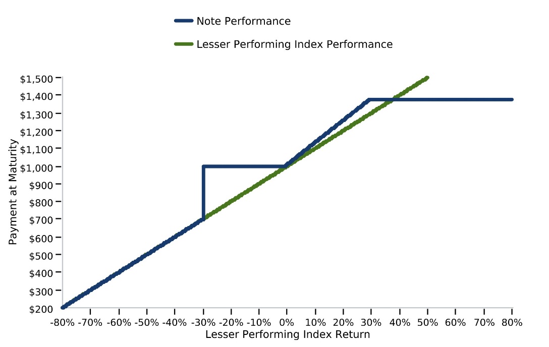 | ● | If the closing level of the Lesser Performing Index increases 60.00%, investors will receive at maturity a return equal to the 37.50% Maximum Return, or $1,375.00 per $1,000 principal amount note, which is the maximum payment at maturity. |