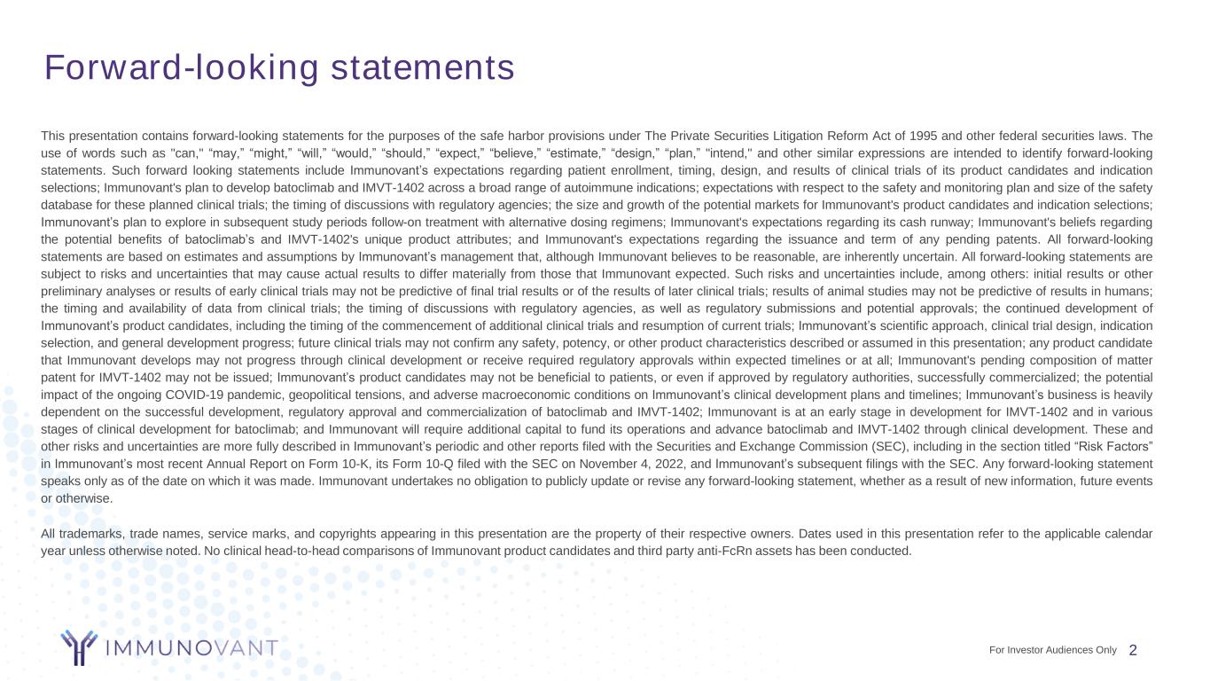 Forward-looking statements 2 This presentation contains forward-looking statements for the purposes of the safe harbor provisions under The Private Securities Litigation Reform Act of 1995 and other federal securities laws. The use of words such as "can," “may,” “might,” “will,” “would,” “should,” “expect,” “believe,” “estimate,” “design,” “plan,” "intend," and other similar expressions are intended to identify forward-looking statements. Such forward looking statements include Immunovant’s expectations regarding patient enrollment, timing, design, and results of clinical trials of its product candidates and indication selections; Immunovant's plan to develop batoclimab and IMVT-1402 across a broad range of autoimmune indications; expectations with respect to the safety and monitoring plan and size of the safety database for these planned clinical trials; the timing of discussions with regulatory agencies; the size and growth of the potential markets for Immunovant's product candidates and indication selections; Immunovant’s plan to explore in subsequent study periods follow-on treatment with alternative dosing regimens; Immunovant's expectations regarding its cash runway; Immunovant's beliefs regarding the potential benefits of batoclimab’s and IMVT-1402's unique product attributes; and Immunovant's expectations regarding the issuance and term of any pending patents. All forward-looking statements are based on estimates and assumptions by Immunovant’s management that, although Immunovant believes to be reasonable, are inherently uncertain. All forward-looking statements are subject to risks and uncertainties that may cause actual results to differ materially from those that Immunovant expected. Such risks and uncertainties include, among others: initial results or other preliminary analyses or results of early clinical trials may not be predictive of final trial results or of the results of later clinical trials; results of animal studies may not be predictive of results in humans; the timing and availability of data from clinical trials; the timing of discussions with regulatory agencies, as well as regulatory submissions and potential approvals; the continued development of Immunovant’s product candidates, including the timing of the commencement of additional clinical trials and resumption of current trials; Immunovant’s scientific approach, clinical trial design, indication selection, and general development progress; future clinical trials may not confirm any safety, potency, or other product characteristics described or assumed in this presentation; any product candidate that Immunovant develops may not progress through clinical development or receive required regulatory approvals within expected timelines or at all; Immunovant's pending composition of matter patent for IMVT-1402 may not be issued; Immunovant’s product candidates may not be beneficial to patients, or even if approved by regulatory authorities, successfully commercialized; the potential impact of the ongoing COVID-19 pandemic, geopolitical tensions, and adverse macroeconomic conditions on Immunovant’s clinical development plans and timelines; Immunovant’s business is heavily dependent on the successful development, regulatory approval and commercialization of batoclimab and IMVT-1402; Immunovant is at an early stage in development for IMVT-1402 and in various stages of clinical development for batoclimab; and Immunovant will require additional capital to fund its operations and advance batoclimab and IMVT-1402 through clinical development. These and other risks and uncertainties are more fully described in Immunovant’s periodic and other reports filed with the Securities and Exchange Commission (SEC), including in the section titled “Risk Factors” in Immunovant’s most recent Annual Report on Form 10-K, its Form 10-Q filed with the SEC on November 4, 2022, and Immunovant’s subsequent filings with the SEC. Any forward-looking statement speaks only as of the date on which it was made. Immunovant undertakes no obligation to publicly update or revise any forward-looking statement, whether as a result of new information, future events or otherwise. All trademarks, trade names, service marks, and copyrights appearing in this presentation are the property of their respective owners. Dates used in this presentation refer to the applicable calendar year unless otherwise noted. No clinical head-to-head comparisons of Immunovant product candidates and third party anti-FcRn assets has been conducted. For Investor Audiences Only