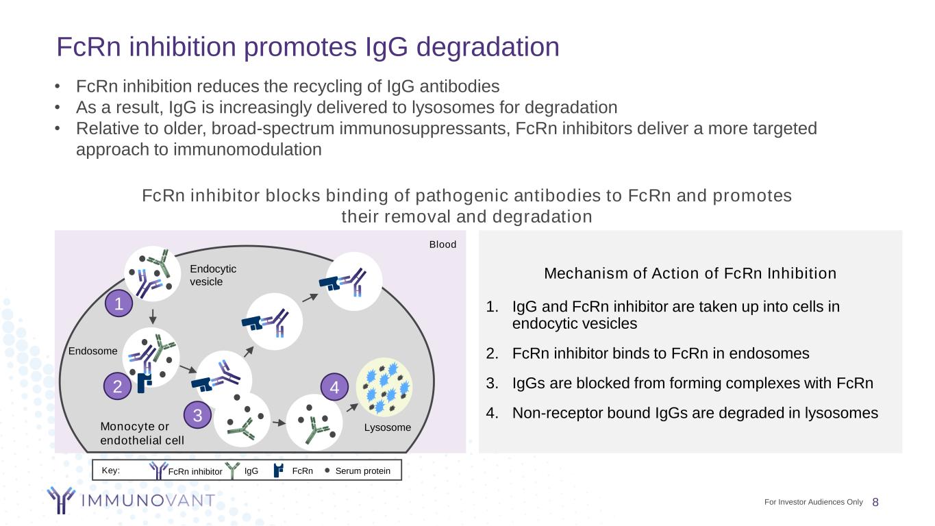 The neonatal Fc receptor (FcRn) promotes recycling of IgG antibodies 7 FcRn Mechanism of Action 1. IgG is taken up into cells in endocytic vesicle 2. FcRn-IgG complexes are sorted from unbound proteins 3. Unbound proteins are trafficked to lysosome for degradation 4. IgG is recycled back into circulation FcRn maintains levels of IgG in circulation by preventing IgG degradation • FcRn extends the half-life of IgG autoantibodies in circulation exacerbating their autoimmune effects • FcRn expressed in a variety of cells Blood Endocytic vesicle Endosome LysosomeMonocyte or endothelial cell Key: Serum proteinIgG FcRn 1 2 3 4 For Investor Audiences Only