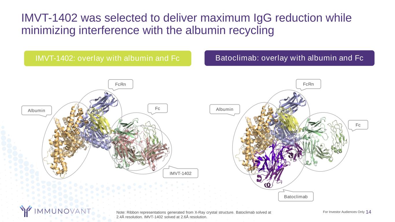 Co-crystal structures for IMVT-1402, for efgartigimod and for SYNT001 all with FcRn 13 FcRn SYNT001 IMVT-1402 Efgartigimod* SYNT001** FcRn IMVT-1402 *https://www.rcsb.org/structure/7Q15; **Blumberg et al., Sci. Adv. 2019 Dec 18;5(12):eaax9586. FcRn Efgartigimod Note that orientation of FcRn is shown a bit differently (based on publicly available data) for efgartigimod vs 1402 and SYNT001 For Investor Audiences Only
