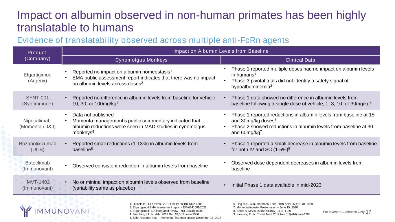 16 IMVT-1402 and placebo demonstrated similar albumin and LDL Day SD, standard deviation; ULN, upper limit of normal; LLN, lower limit of normal; Arrows indicate time of dosing. Data on file at Immunovant Day Batoclimab 50 mg/kg (n=3) IMVT-1402 50 mg/kg (n=7) IMVT-1402 5 mg/kg (n=7) Placebo (n=3) LDL concentration (mmol/L), mean ± SDAlbumin concentration (g/L), mean ± SD -12 7 14 21 28 35 42 49 56 0 1 2 3 4 //10 20 30 40 50 60 ULN LLN -12 7 14 21 28 35 42 49 56 // Head-to-Head Monkey Study Day -12 7 14 21 28 35 42 49 56 // Cholesterol concentration (mmol/L), mean ± SD 0 1 2 3 4 5 6 For Investor Audiences Only
