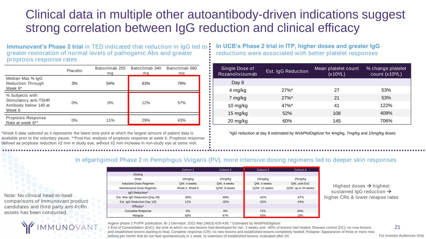 Clinical data in MG across anti-FcRn assets indicate strong correlation between deep IgG reduction and increased clinical efficacy The ADAPT Phase 3 trial of IV efgartigimod demonstrated that patients with deeper IgG reductions saw greater improvements in their disease activity (MG-ADL) compared to patients with lesser IgG suppression Patient-level data from Efgartigimod (n=84) arm in P3 study In Batoclimab's (IMVT) Phase 2 trial in MG, we observed deeper IgG and AChR autoantibody reductions correlated with bigger MG-ADL changes Data at week 7 Placebo (N=6) Batoclimab 340 mg / week (N=5) Batoclimab 680 mg / week (N=6) % Change in total IgG from baseline -3% -59% -76% % Change in Anti-AChR-IgG from baseline 2% -54% -87% % Change in MG-ADL from baseline 3% -23% -38% While a small n, deeper IgG and anti-AChR autoantibody reductions achieved greater % improvements in MG-ADL Nipocalimab Phase 2 trial in MG showed a correlation between IgG reductions and clinical activity Note: No clinical head-to-head comparisons of Immunovant product candidates and third party anti-FcRn assets has been conducted. 20 For Investor Audiences Only