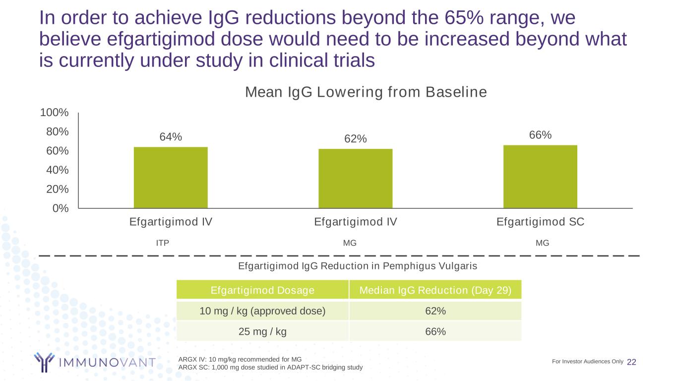 Clinical data in multiple other autoantibody-driven indications suggest strong correlation between IgG reduction and clinical efficacy Immunovant’s Phase 2 trial in TED indicated that reduction in IgG led to greater restoration of normal levels of pathogenic Abs and greater proptosis response rates In efgartigimod Phase 2 in Pemphigus Vulgaris (PV), more intensive dosing regimens led to deeper skin responses In UCB’s Phase 2 trial in ITP, higher doses and greater IgG reductions were associated with better platelet responses *Week 6 data selected as it represents the latest time point at which the largest amount of patient data is available prior to the voluntary pause. **Post-hoc analysis of proptosis response at week 6. Proptosis response defined as proptosis reduction ≥2 mm in study eye, without ≥2 mm increase in non-study eye at same visit. Placebo Batoclimab 255 mg Batoclimab 340 mg Batoclimab 680 mg Median Max % IgG Reduction Through Week 6* 3% 54% 63% 79% % Subjects with Stimulatory anti-TSHR Antibody below 140 at Week 6 0% 0% 12% 57% Proptosis Response Rate at week 6** 0% 11% 29% 43% Cohort 1 Cohort 2 Cohort 3 Cohort 4 Dosing Dose 10mg/kg 10mg/kg 10mg/kg 25mg/kg Induction Dose Regimen QW, 4 weeks QW, 4 weeks QW, 4 weeks QW, until EoC Maintenance Dose Regimen Week 2, Week 6 Q2W, 8 weeks Q2W, 12 weeks Q2W, up to 34 weeks IgG Reduction* Est. Max IgG Reduction (Day 28) -56% -69% -62% -67% Est. IgG Reduction Day 120 11% -33% -52% -54% Efficacy† Complete Response 0% 0% 71% 60% Relapse 50% 67% 43% 29% Highest doses → highest sustained IgG reduction → higher CRs & lower relapse rates Argenx phase 2 PV/PF publication, Br J Dermatol. 2022 Mar;186(3):429-439; * Estimated by WebPlotDigitizer † End of Consolidation (EoC): the time at which no new lesions had developed for min. 2 weeks and ~80% of lesions had healed; Disease control (DC): no new lesions and established lesions starting to heal; Complete response (CR): no new lesions and established lesions completely healed; Relapse: Appearance of three or more new lesions per month that do not heal spontaneously in 1 week, or extension of established lesions, evaluated after DC Single Dose of Rozanolixizumab Est. IgG Reduction Mean platelet count (x109/L) % change platelet count (x109/L) Day 8 4 mg/kg 27%* 27 53% 7 mg/kg 27%* 21 53% 10 mg/kg 47%* 41 122% 15 mg/kg 52% 108 409% 20 mg/kg 60% 145 706% *IgG reduction at day 8 estimated by WebPlotDigitizer for 4mg/kg, 7mg/kg and 10mg/kg doses Note: No clinical head-to-head comparisons of Immunovant product candidates and third party anti-FcRn assets has been conducted. 21 For Investor Audiences Only