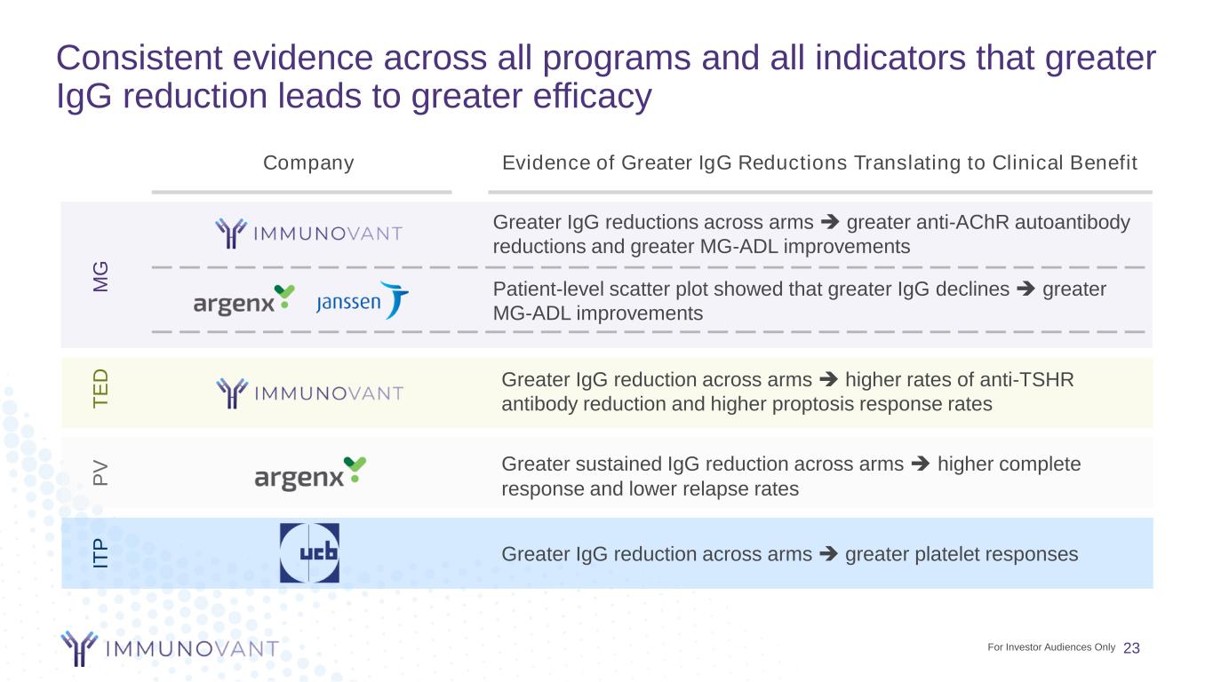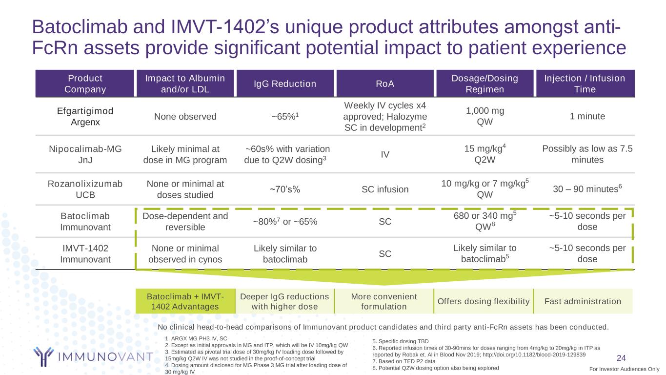 Consistent evidence across all programs and all indicators that greater IgG reduction leads to greater efficacy Company Evidence of Greater IgG Reductions Translating to Clinical Benefit M G T E D IT P Greater IgG reductions across arms ➔ greater anti-AChR autoantibody reductions and greater MG-ADL improvements Patient-level scatter plot showed that greater IgG declines ➔ greater MG-ADL improvements Greater IgG reduction across arms ➔ higher rates of anti-TSHR antibody reduction and higher proptosis response rates Greater IgG reduction across arms ➔ greater platelet responses P V Greater sustained IgG reduction across arms ➔ higher complete response and lower relapse rates 23For Investor Audiences Only