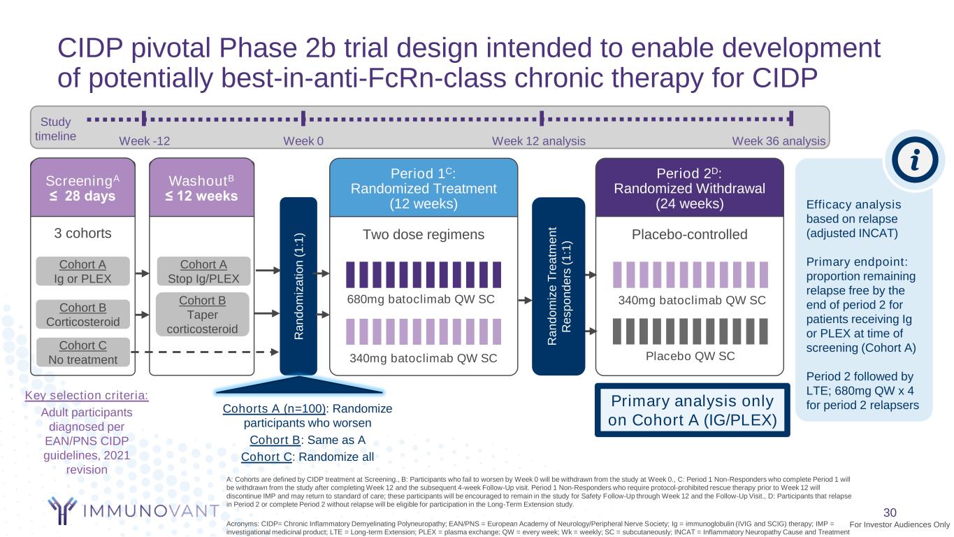 Our development approach applies key learnings from historical and ongoing CIDP trials to address challenges unique to CIDP 29 Trial risks Mitigations Mitigation included in other anti-FcRn Trials* Mitigation included in IMVT trial Disease heterogeneity and challenging diagnosis Diagnostic algorithm X Mix of active and inactive disease among those enrolled creates risk of low relapse rate in the placebo arm, thereby shrinking potential effect size for the investigational product Patients enrolled in placebo arm of trial may not have demonstrated initial response to investigational product Double enrichment: Not All**1.Subjects must worsen after withdrawal / taper of standard of care (e.g. IVIG/SCIG, PLEX, or steroids) on study entry, AND 2.Subjects must then improve on open label investigational product Not All** Steroids are a common standard of care outside the US and often can't be fully tapered, weakening double enrichment Third enrichment: Primary endpoint on IVIG/SCIG/Plex cohort only to maximize the potential effect size X Lack of dose exploration Data on multiple doses in “Period 1” of trial will inform future development strategy X Single large trial limits flexibility to optimize product label and differentiation Smaller, initial pivotal trial that can be adjusted or complemented with a second smaller pivotal trial to optimize product label and differentiation based on new data X Notes: *Other anti-FcRn trials in CIDP include efgartigimod, nipocalimab, and rozanolixizumab. **clinical trial designs for efgartigimod in CIDP and nipocalimab in CIDP include double enrichment in trial design. Rozanolixizumab ph2 trial in CIDP did not include double enrichment. Two-stage approach (if additional trial is required for registration) has the potential to deliver a differentiated product label with a larger effect size For Investor Audiences Only