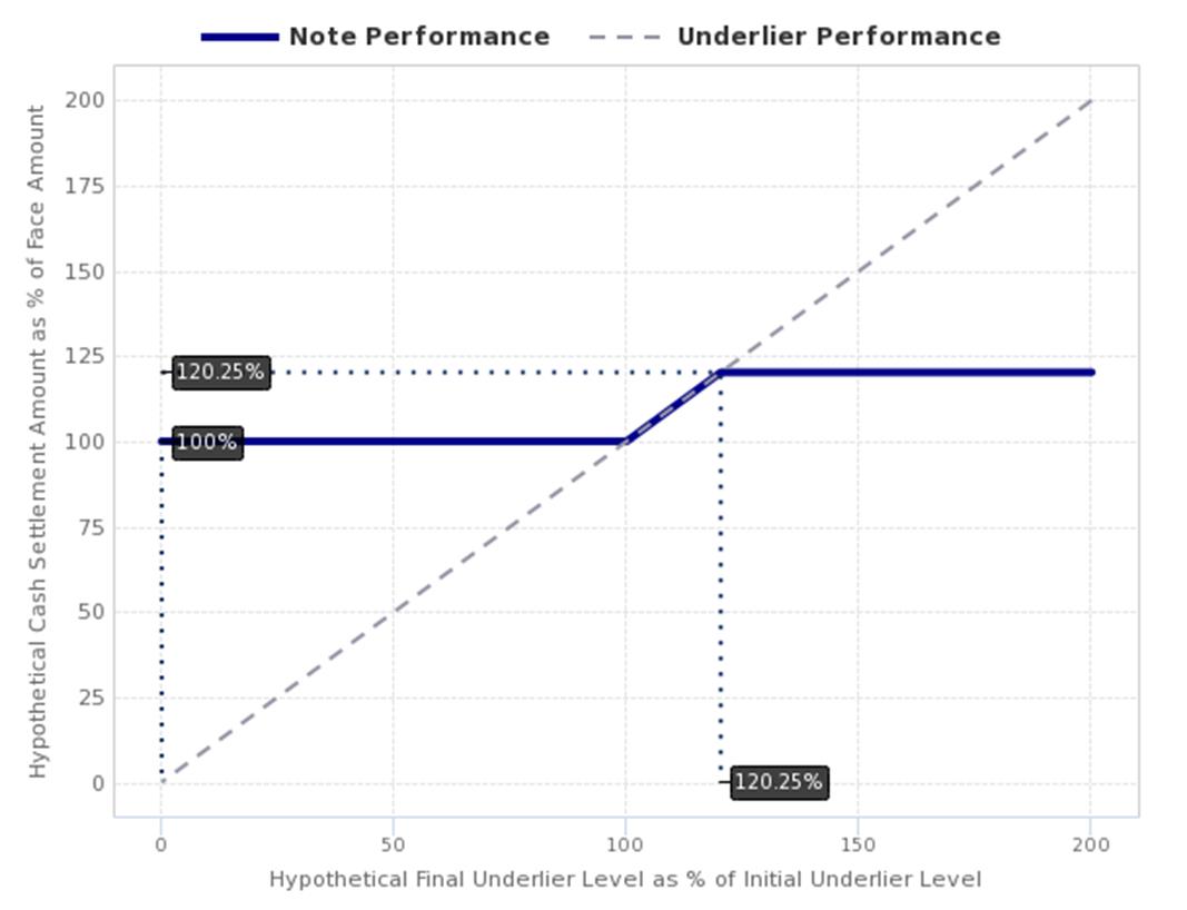 If the final index level on the determination date is greater than the initial index level (set on the trade date), the return on your notes will be positive and will equal the index return, subject to the maximum settlement amount of at least $1,202.5 (set on the trade date) for each $1,000 face amount of your notes. If the final index level is equal to or less than the initial index level, you will receive the face amount of your notes.