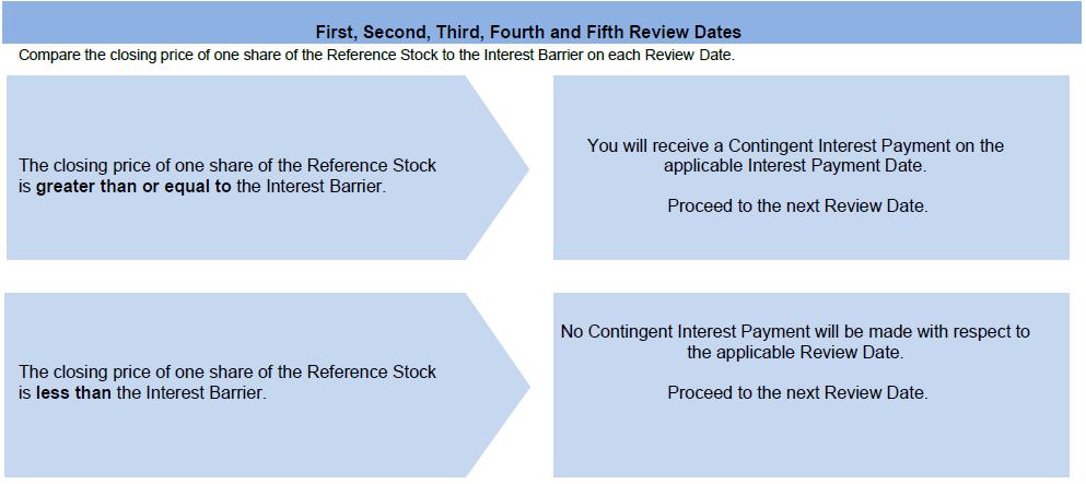 | ● | THE NOTES DO NOT GUARANTEE THE PAYMENT OF INTEREST AND MAY NOT PAY ANY INTEREST AT ALL — If the notes have not been automatically called, we will make a Contingent Interest Payment with respect to a Review Date only if the closing price of one share of the Reference Stock on that Review Date is greater than or equal to the Interest Barrier. If the closing price of one share of the Reference Stock on that Review Date is less than the Interest Barrier, no Contingent Interest Payment will be made with respect to that Review Date. Accordingly, if the closing price of one share of the Reference Stock on each Review Date is less than the Interest Barrier, you will not receive any interest payments over the term of the notes. |