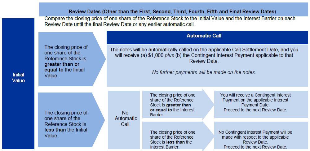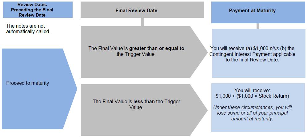 Automatic Call: If the closing price of one share of the Reference Stock on any Review Date (other than the first, second, third, fourth, fifth and final Review Dates) is greater than or equal to the Initial Value, the notes will be automatically called for a cash payment, for each $1,000 principal amount note, equal to (a) $1,000 plus (b) the Contingent Interest Payment applicable to that Review Date, payable on the applicable Call Settlement Date. No further payments will be made on the notes. Payment at Maturity: If the notes have not been automatically called and the Final Value is greater than or equal to the Trigger Value, you will receive a cash payment at maturity, for each $1,000 principal amount note, equal to (a) $1,000 plus (b) the Contingent Interest Payment applicable to the final Review Date. If the notes have not been automatically called and the Final Value is less than the Trigger Value, your payment at maturity per $1,000 principal amount note will be calculated as follows: $1,000 + ($1,000 × Stock Return) If the notes have not been automatically called and the Final Value is less than the Trigger Value, you will lose more than 40.00% of your principal amount at maturity and could lose all of your principal amount at maturity. Stock Return: (Final