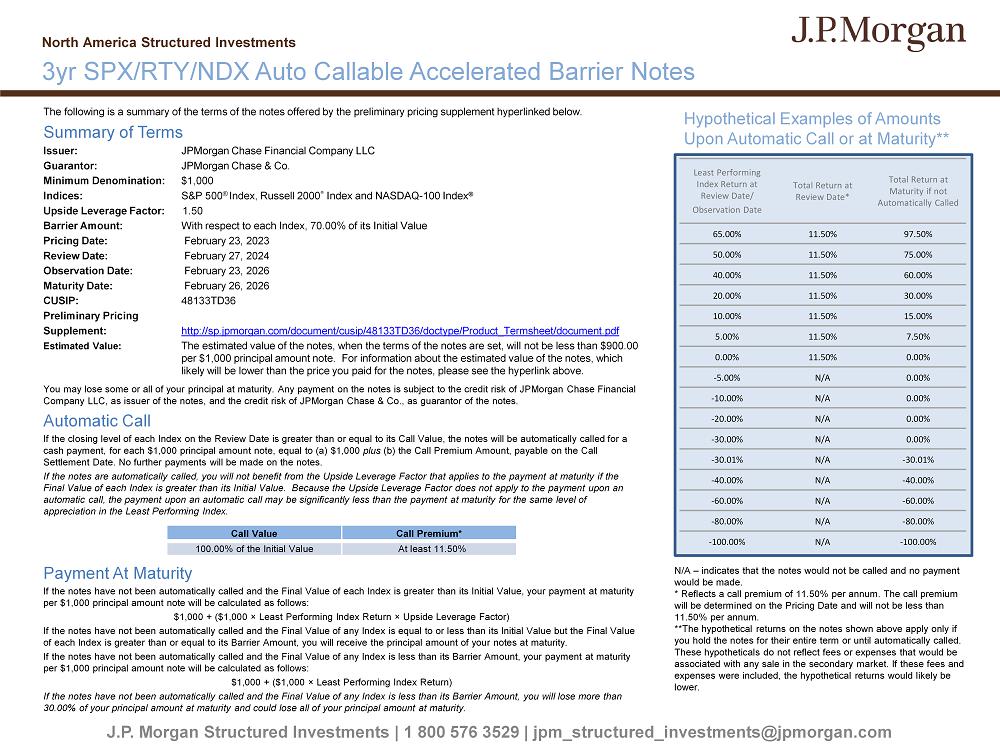 The following is a summary of the terms of the notes offered by the preliminary pricing supplement hyperlinked below. Summary of Terms Issuer: JPMorgan Chase Financial Company LLC Guarantor: JPMorgan Chase & Co. Minimum Denomination: $1,000 Indices: S&P 500 ® Index , Russell 2000 ® Index and NASDAQ - 100 Index ® Upside Leverage Factor: 1.50 Barrier Amount: With respect to each Index, 70.00% of its Initial Value Pricing Date: February 23, 2023 Review Date: February 27, 2024 Observation Date: February 23, 2026 Maturity Date: February 26, 2026 CUSIP: 48133TD36 Preliminary Pricing Supplement: http://sp.jpmorgan.com/document/cusip/48133TD36/doctype/Product_Termsheet/document.pdf Estimated Value: The estimated value of the notes, when the terms of the notes are set, will not be less than $900.00 per $1,000 principal amount note. For information about the estimated value of the notes, which likely will be lower than the price you paid for the notes, please see the hyperlink above. You may lose some or all of your principal at maturity. Any payment on the notes is subject to the credit risk of JPMorgan Ch ase Financial Company LLC, as issuer of the notes, and the credit risk of JPMorgan Chase & Co., as guarantor of the notes. Automatic Call If the closing level of each Index on the Review Date is greater than or equal to its Call Value, the notes will be automatic all y called for a cash payment, for each $1,000 principal amount note, equal to (a) $1,000 plus (b) the Call Premium Amount, payable on the Call Settlement Date. No further payments will be made on the notes. If the notes are automatically called, you will not benefit from the Upside Leverage Factor that applies to the payment at maturity if the Final Value of each Index is greater than its Initial Value. Because the Upside Leverage Factor does not apply to the payment u pon an automatic call, the payment upon an automatic call may be significantly less than the payment at maturity for the same level of appreciation in the Least Performing Index. Payment At Maturity If the notes have not been automatically called and the Final Value of each Index is greater than its Initial Value, your pay men t at maturity per $1,000 principal amount note will be calculated as follows: $1,000 + ($1,000 î Least Performing Index Return î Upside Leverage Factor) If the notes have not been automatically called and the Final Value of any Index is equal to or less than its Initial Value b ut the Final Value of each Index is greater than or equal to its Barrier Amount, you will receive the principal amount of your notes at maturity . If the notes have not been automatically called and the Final Value of any Index is less than its Barrier Amount, your paymen t a t maturity per $1,000 principal amount note will be calculated as follows: $1,000 + ($1,000 î Least Performing Index Return) If the notes have not been automatically called and the Final Value of any Index is less than its Barrier Amount, you will lo se more than 30.00% of your principal amount at maturity and could lose all of your principal amount at maturity. J.P. Morgan Structured Investments | 1 800 576 3529 | jpm_structured_investments@jpmorgan.com 3yr SPX/RTY/NDX Auto Callable Accelerated Barrier Notes North America Structured Investments Call Value Call Premium* 100.00% of the Initial Value At least 11.50% Hypothetical Examples of Amounts Upon Automatic Call or at Maturity** Least Performing Index Return at Review Date/ Observation Date Total Return at Review Date* Total Return at Maturity if not Automatically Called 65.00% 11.50% 97.50% 50.00% 11.50% 75.00% 40.00% 11.50% 60.00% 20.00% 11.50% 30.00% 10.00% 11.50% 15.00% 5.00% 11.50% 7.50% 0.00% 11.50% 0.00% - 5.00% N/A 0.00% - 10.00% N/A 0.00% - 20.00% N/A 0.00% - 30.00% N/A 0.00% - 30.01% N/A - 30.01% - 40.00% N/A - 40.00% - 60.00% N/A - 60.00% - 80.00% N/A - 80.00% - 100.00% N/A - 100.00% N/A – indicates that the notes would not be called and no payment would be made. * Reflects a call premium of 11.50% per annum. The call premium will be determined on the Pricing Date and will not be less than 11.50% per annum. **The hypothetical returns on the notes shown above apply only if you hold the notes for their entire term or until automatically called. These hypotheticals do not reflect fees or expenses that would be associated with any sale in the secondary market. If these fees and expenses were included, the hypothetical returns would likely be lower.