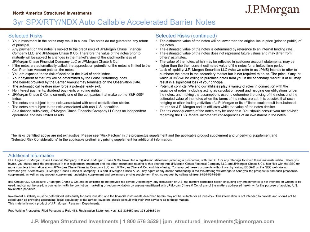 J.P. Morgan Structured Investments | 1 800 576 3529 | jpm_structured_investments@jpmorgan.com Selected Risks • Your investment in the notes may result in a loss. The notes do not guarantee any return of principal. • Any payment on the notes is subject to the credit risks of JPMorgan Chase Financial Company LLC and JPMorgan Chase & Co. Therefore the value of the notes prior to maturity will be subject to changes in the market’s view of the creditworthiness of JPMorgan Chase Financial Company LLC or JPMorgan Chase & Co. • If the notes are automatically called, the appreciation potential of the notes is limited to the Call Premium Amount paid on the notes. • You are exposed to the risk of decline in the level of each Index. • Your payment at maturity will be determined by the Least Performing Index. • The benefit provided by the Barrier Amount may terminate on the Observation Date. • The automatic call feature may force a potential early exit. • No interest payments, dividend payments or voting rights. • JPMorgan Chase & Co. is currently one of the companies that make up the S&P 500 ® Index. • The notes are subject to the risks associated with small capitalization stocks. • The notes are subject to the risks associated with non - U.S. securities. • As a finance subsidiary, JPMorgan Chase Financial Company LLC has no independent operations and has limited assets. Selected Risks (continued) • The estimated value of the notes will be lower than the original issue price (price to public) of the notes. • The estimated value of the notes is determined by reference to an internal funding rate. • The estimated value of the notes does not represent future values and may differ from others’ estimates. • The value of the notes, which may be reflected in customer account statements, may be higher than the then current estimated value of the notes for a limited time period. • Lack of liquidity: J.P. Morgan Securities LLC (who we refer to as JPMS) intends to offer to purchase the notes in the secondary market but is not required to do so. The price, if any, at which JPMS will be willing to purchase notes from you in the secondary market, if at all, may result in a significant loss of your principal. • Potential conflicts: We and our affiliates play a variety of roles in connection with the issuance of notes, including acting as calculation agent and hedging our obligations under the notes, and making the assumptions used to determine the pricing of the notes and the estimated value of the notes when the terms of the notes are set. It is possible that such hedging or other trading activities of J.P. Morgan or its affiliates could result in substantial returns for J.P. Morgan and its affiliates while the value of the notes decline. • The tax consequences of the notes may be uncertain. You should consult your tax adviser regarding the U.S. federal income tax consequences of an investment in the notes. Additional Information SEC Legend: JPMorgan Chase Financial Company LLC and JPMorgan Chase & Co. have filed a registration statement (including a pr osp ectus) with the SEC for any offerings to which these materials relate. Before you invest, you should read the prospectus in that registration statement and the other documents relating to this offering that JPM organ Chase Financial Company LLC and JPMorgan Chase & Co. has filed with the SEC for more complete information about JPMorgan Chase Financial Company LLC and JPMorgan Chase & Co. and this offering. You may get the se documents without cost by visiting EDGAR on the SEC web site at www.sec.gov. Alternatively, JPMorgan Chase Financial Company LLC and JPMorgan Chase & Co., any agent or any dealer participat ing in the this offering will arrange to send you the prospectus and each prospectus supplement, as well as any product supplement, underlying supplement and preliminary pricing supplement if you so request by cal ling toll - free 1 - 866 - 535 - 9248. IRS Circular 230 Disclosure: JPMorgan Chase & Co. and its affiliates do not provide tax advice. Accordingly, any discussion o f U .S. tax matters contained herein (including any attachments) is not intended or written to be used, and cannot be used, in connection with the promotion, marketing or recommendation by anyone unaffiliated with JPMorgan Cha se & Co. of any of the matters addressed herein or for the purpose of avoiding U.S. tax - related penalties. Investment suitability must be determined individually for each investor, and the financial instruments described herein may not be suitable for all investors. This information is not intended to provide and should not be relied upon as providing accounting, legal, regulatory or tax advice. Investors should consult with their own advisers as to the se matters. This material is not a product of J.P. Morgan Research Departments. Free Writing Prospectus Filed Pursuant to Rule 433, Registration Statement Nos. 333 - 236659 and 333 - 236659 - 01 North America Structured Investments 3yr SPX/RTY/NDX Auto Callable Accelerated Barrier Notes The risks identified above are not exhaustive. Please see “Risk Factors” in the prospectus supplement and the applicable prod uct supplement and underlying supplement and “Selected Risk Considerations” in the applicable preliminary pricing supplement for additional information.