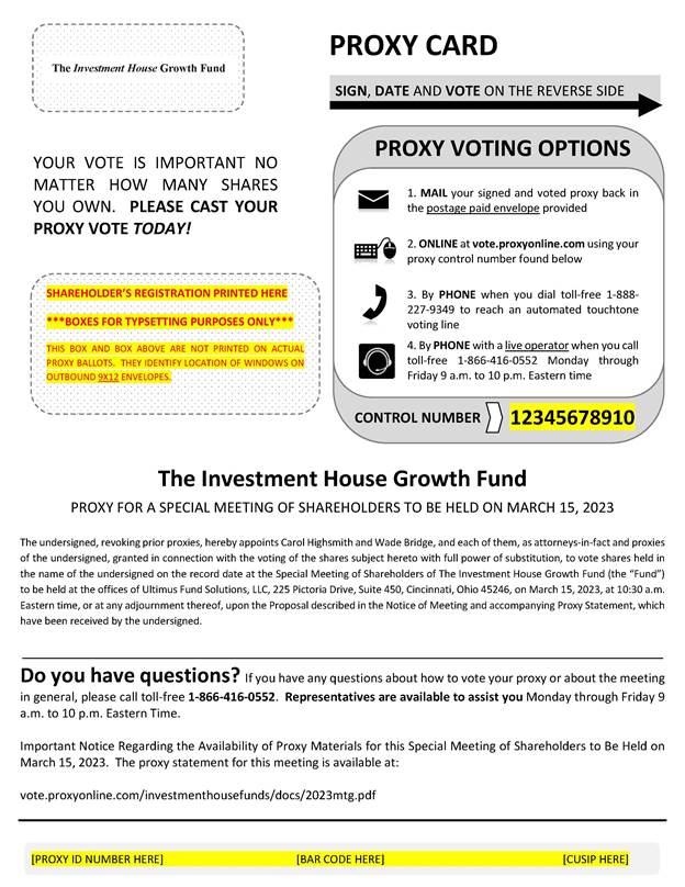 The Board of Trustees recommends you vote FOR the Proposal identified in this Proxy Statement. Shareholders of record at the close of business on January 20, 2023 are entitled to notice of and to vote at this meeting or any adjournment thereof. A copy of the Proxy Statement is available to you at https://vote.proxyonline.com/investmenthousefunds/docs/2023mtg.pdf. Information on how to vote can be obtained by calling (866) 416-0552. Representatives are available Monday through Friday from 9:00 a.m. to 10:00 p.m. Eastern time.