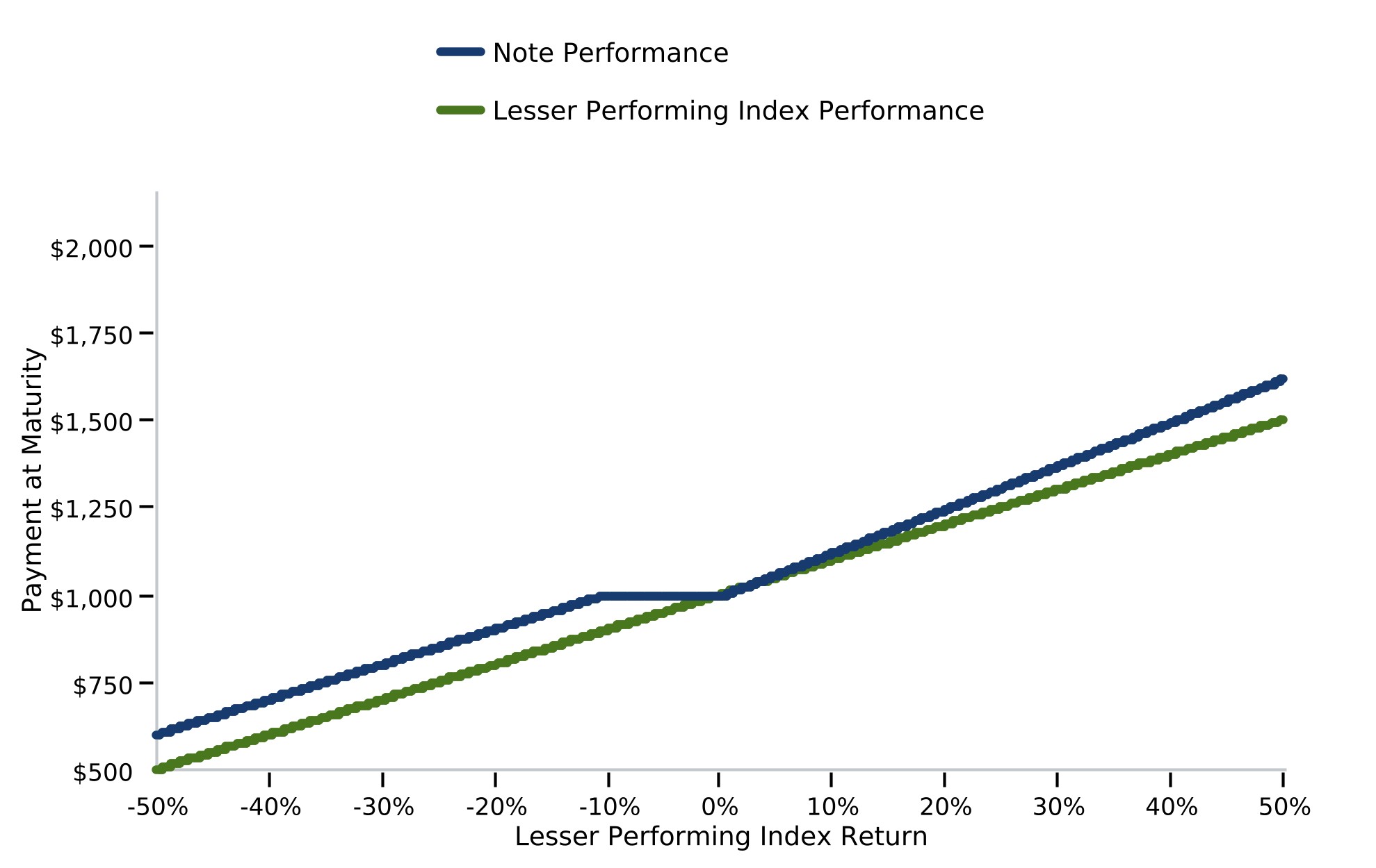 The following graph demonstrates the hypothetical payments at maturity on the notes for a sub-set of Lesser Performing Index Returns detailed in the table above (-50% to 50%). There can be no assurance that the performance of the Lesser Performing Index will result in the return of any of your principal amount in excess of $100.00 per $1,000 principal amount note, subject to the credit risks of JPMorgan Financial and JPMorgan Chase & Co.