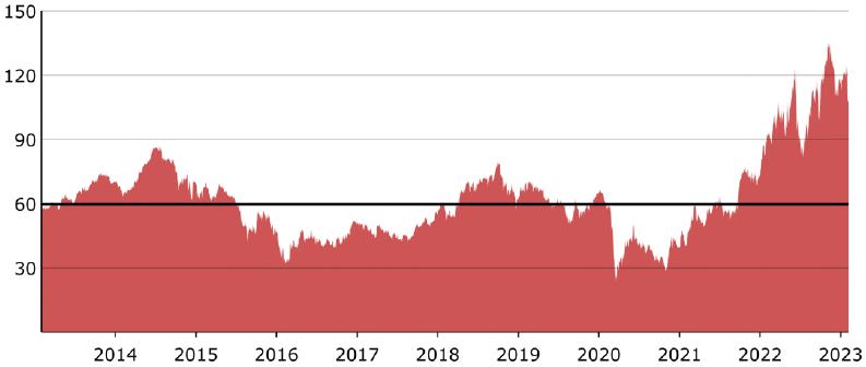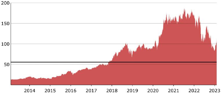 The following graph sets forth the historical performance of the relevant Reference Stock based on the daily historical closing prices from February 6, 2013 to February 6, 2023, as reported on the Bloomberg Professional® service. The line in black represents the Downside Threshold and Coupon Barrier, equal to 55.60% of the Official Closing Price on February 6, 2023. We have not undertaken any independent review of, or made any due diligence inquiry with respect to, the information obtained from the Bloomberg Professional® service. The historical prices of the Reference Stock should not be taken as an indication of future performance.