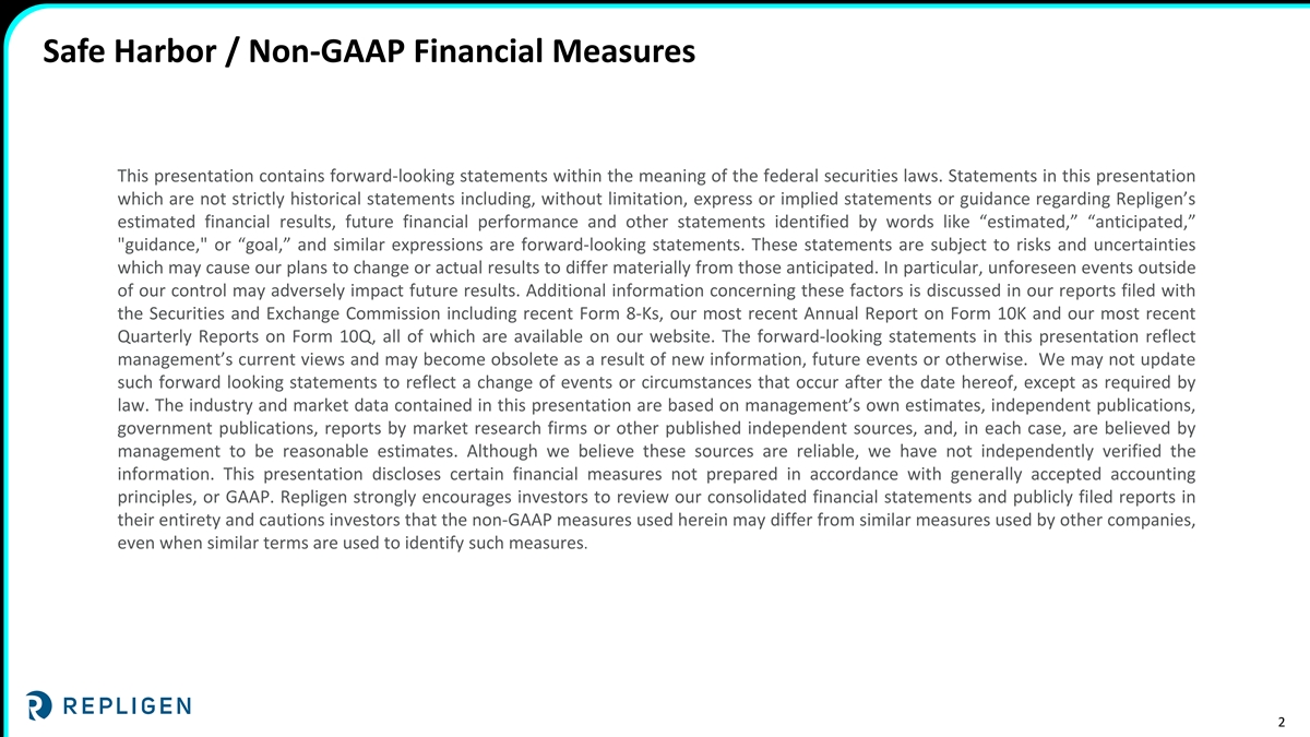 Safe Harbor / Non-GAAP Financial Measures This presentation contains forward-looking statements within the meaning of the federal securities laws. Statements in this presentation which are not strictly historical statements including, without limitation, express or implied statements or guidance regarding Repligen’s estimated financial results, future financial performance and other statements identified by words like “estimated,” “anticipated,” guidance, or “goal,” and similar expressions are forward-looking statements. These statements are subject to risks and uncertainties which may cause our plans to change or actual results to differ materially from those anticipated. In particular, unforeseen events outside of our control may adversely impact future results. Additional information concerning these factors is discussed in our reports filed with the Securities and Exchange Commission including recent Form 8-Ks, our most recent Annual Report on Form 10K and our most recent Quarterly Reports on Form 10Q, all of which are available on our website. The forward-looking statements in this presentation reflect management’s current views and may become obsolete as a result of new information, future events or otherwise. We may not update such forward looking statements to reflect a change of events or circumstances that occur after the date hereof, except as required by law. The industry and market data contained in this presentation are based on management’s own estimates, independent publications, government publications, reports by market research firms or other published independent sources, and, in each case, are believed by management to be reasonable estimates. Although we believe these sources are reliable, we have not independently verified the information. This presentation discloses certain financial measures not prepared in accordance with generally accepted accounting principles, or GAAP. Repligen strongly encourages investors to review our consolidated financial statements and publicly filed reports in their entirety and cautions investors that the non-GAAP measures used herein may differ from similar measures used by other companies, even when similar terms are used to identify such measures. 2