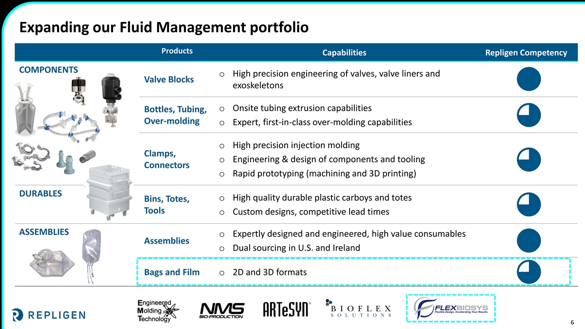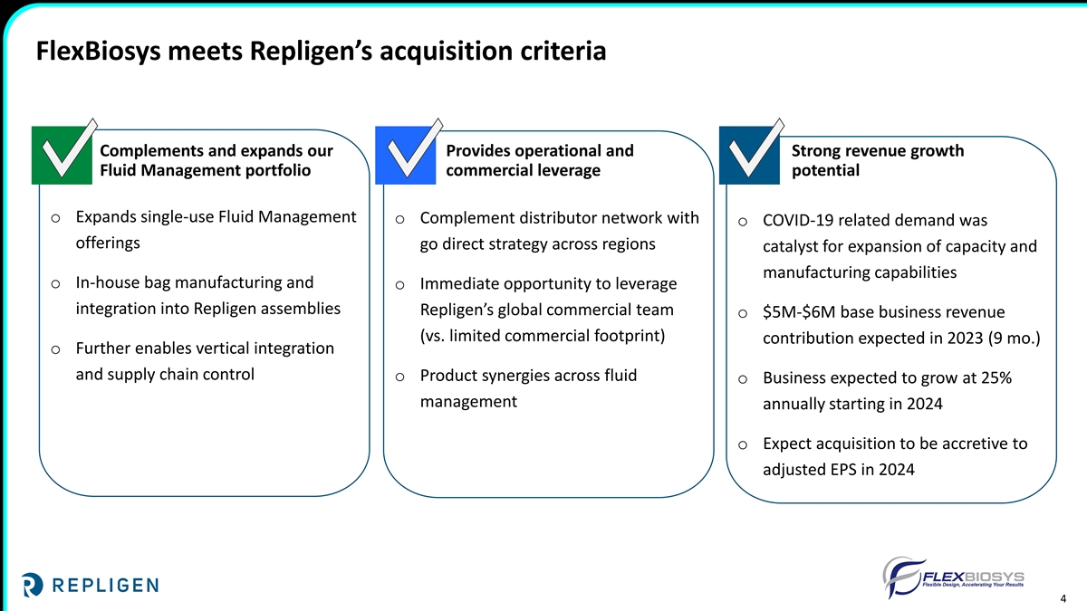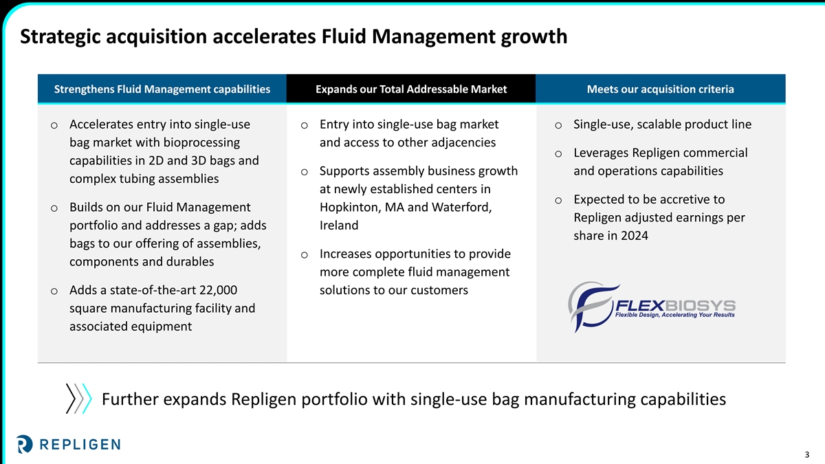 Strategic acquisition accelerates Fluid Management growth Strengthens Fluid Management capabilities Expands our Total Addressable Market Meets our acquisition criteria o Accelerates entry into single-use o Entry into single-use bag market o Single-use, scalable product line bag market with bioprocessing and access to other adjacencies o Leverages Repligen commercial capabilities in 2D and 3D bags and o Supports assembly business growth and operations capabilities complex tubing assemblies at newly established centers in o Expected to be accretive to o Builds on our Fluid Management Hopkinton, MA and Waterford, Repligen adjusted earnings per portfolio and addresses a gap; adds Ireland share in 2024 bags to our offering of assemblies, o Increases opportunities to provide components and durables more complete fluid management o Adds a state-of-the-art 22,000 solutions to our customers square manufacturing facility and associated equipment Further expands Repligen portfolio with single-use bag manufacturing capabilities 3