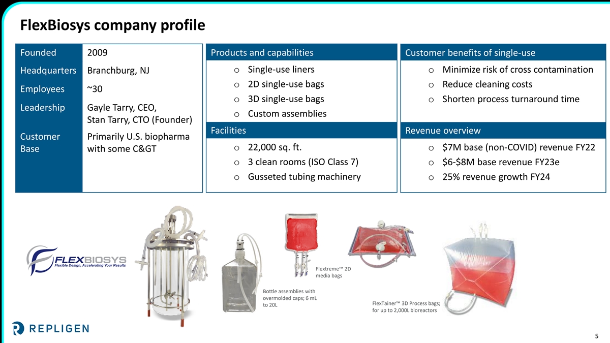 FlexBiosys meets Repligen’s acquisition criteria Complements and expands our Provides operational and Strong revenue growth Fluid Management portfolio commercial leverage potential o Expands single-use Fluid Management o Complement distributor network with o COVID-19 related demand was offerings go direct strategy across regions catalyst for expansion of capacity and manufacturing capabilities o In-house bag manufacturing and o Immediate opportunity to leverage integration into Repligen assemblies Repligen’s global commercial team o $5M-$6M base business revenue (vs. limited commercial footprint) contribution expected in 2023 (9 mo.) o Further enables vertical integration and supply chain control o Product synergies across fluid o Business expected to grow at 25% management annually starting in 2024 o Expect acquisition to be accretive to adjusted EPS in 2024 4