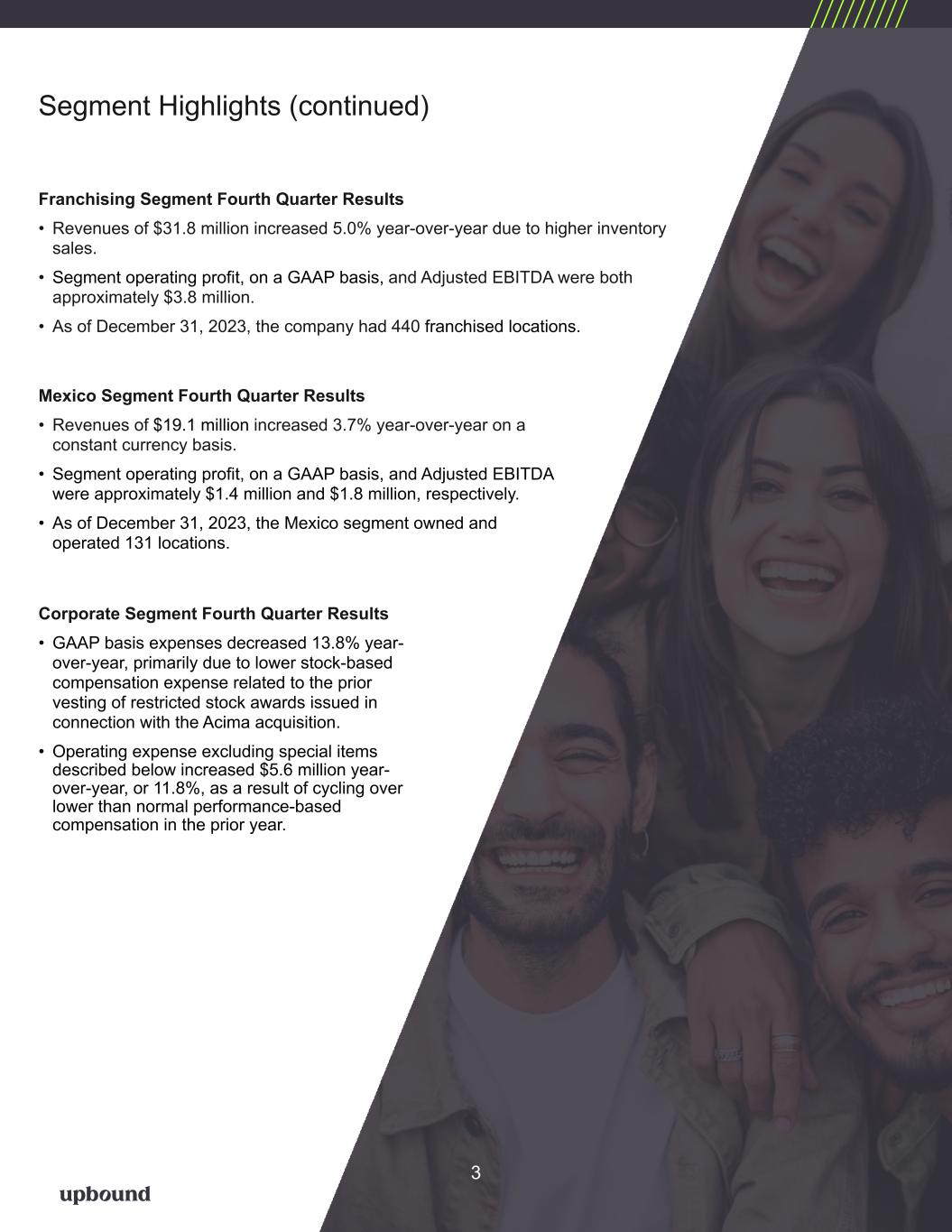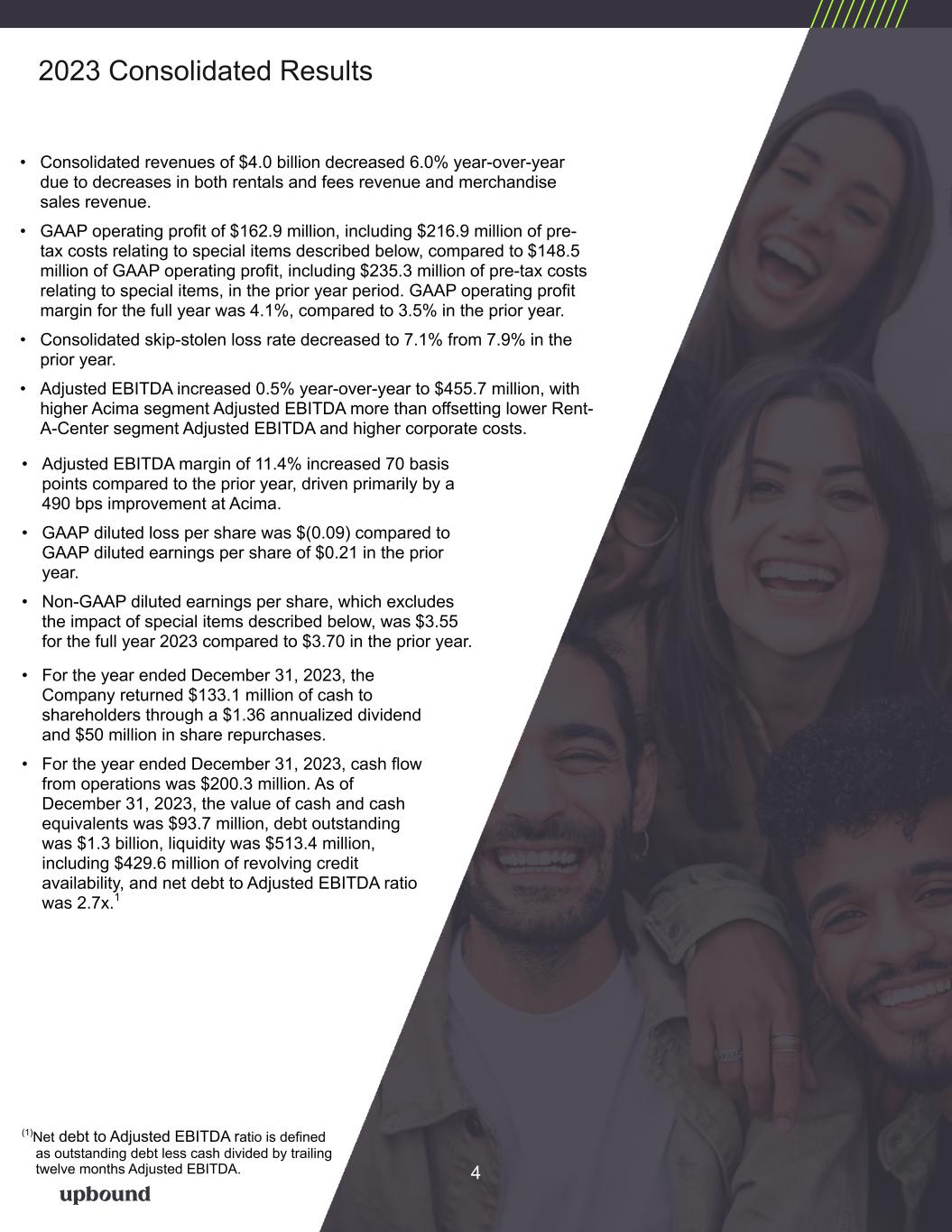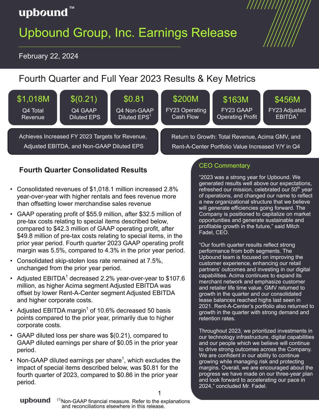 Q4 Total Revenue Q4 GAAP Diluted EPS $1,018M $(0.21) Q4 Non-GAAP Diluted EPS1 CEO Commentary “2023 was a strong year for Upbound. We generated results well above our expectations, refreshed our mission, celebrated our 50th year of operations, and changed our name to reflect a new organizational structure that we believe will generate efficiencies going forward. The Company is positioned to capitalize on market opportunities and generate sustainable and profitable growth in the future,” said Mitch Fadel, CEO. “Our fourth quarter results reflect strong performance from both segments. The Upbound team is focused on improving the customer experience, enhancing our retail partners’ outcomes and investing in our digital capabilities. Acima continues to expand its merchant network and emphasize customer and retailer life time value. GMV returned to growth in the quarter and our consolidated lease balances reached highs last seen in 2021. Rent-A-Center’s portfolio also returned to growth in the quarter with strong demand and retention rates. Throughout 2023, we prioritized investments in our technology infrastructure, digital capabilities and our people which we believe will continue to drive strong outcomes across the Company. We are confident in our ability to continue growing while managing risk and protecting margins. Overall, we are encouraged about the progress we have made on our three-year plan and look forward to accelerating our pace in 2024,” concluded Mr. Fadel. Achieves Increased FY 2023 Targets for Revenue, Adjusted EBITDA, and Non-GAAP Diluted EPS Upbound Group, Inc. Earnings Release February 22, 2024 Fourth Quarter and Full Year 2023 Results & Key Metrics FY23 Operating Cash Flow $200M FY23 GAAP Operating Profit Fourth Quarter Consolidated Results • Consolidated revenues of $1,018.1 million increased 2.8% year-over-year with higher rentals and fees revenue more than offsetting lower merchandise sales revenue • GAAP operating profit of $55.9 million, after $32.5 million of pre-tax costs relating to special items described below, compared to $42.3 million of GAAP operating profit, after $49.8 million of pre-tax costs relating to special items, in the prior year period. Fourth quarter 2023 GAAP operating profit margin was 5.5%, compared to 4.3% in the prior year period. • Consolidated skip-stolen loss rate remained at 7.5%, unchanged from the prior year period. • Adjusted EBITDA1 decreased 2.2% year-over-year to $107.6 million, as higher Acima segment Adjusted EBITDA was offset by lower Rent-A-Center segment Adjusted EBITDA and higher corporate costs. • Adjusted EBITDA margin1 of 10.6% decreased 50 basis points compared to the prior year, primarily due to higher corporate costs. • GAAP diluted loss per share was $(0.21), compared to GAAP diluted earnings per share of $0.05 in the prior year period. • Non-GAAP diluted earnings per share1, which excludes the impact of special items described below, was $0.81 for the fourth quarter of 2023, compared to $0.86 in the prior year period. Return to Growth: Total Revenue, Acima GMV, and Rent-A-Center Portfolio Value Increased Y/Y in Q4 1 (1)Non-GAAP financial measure. Refer to the explanations and reconciliations elsewhere in this release. $0.81 FY23 Adjusted EBITDA1 $456M$163M
