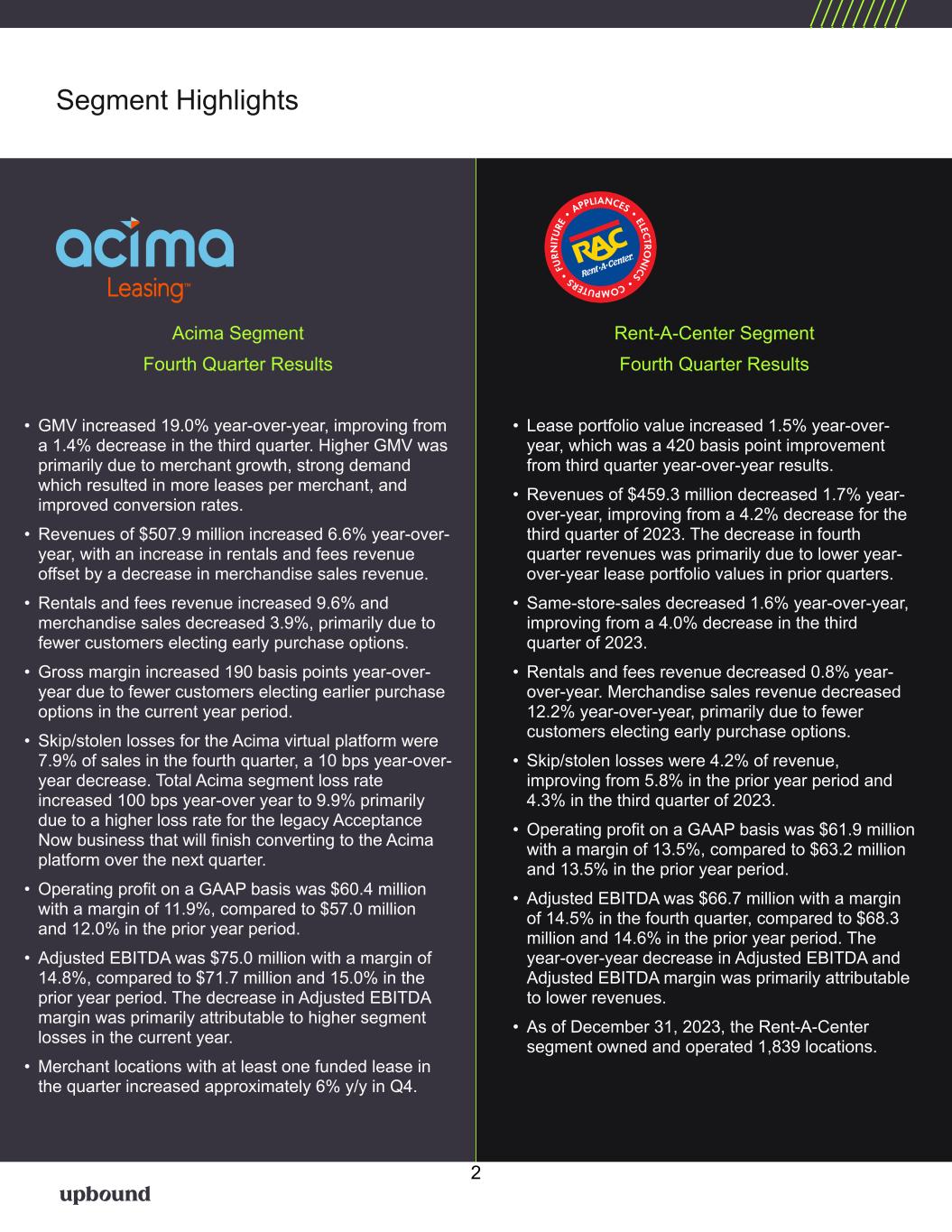 Segment Highlights Rent-A-Center Segment Fourth Quarter Results • Lease portfolio value increased 1.5% year-over- year, which was a 420 basis point improvement from third quarter year-over-year results. • Revenues of $459.3 million decreased 1.7% year- over-year, improving from a 4.2% decrease for the third quarter of 2023. The decrease in fourth quarter revenues was primarily due to lower year- over-year lease portfolio values in prior quarters. • Same-store-sales decreased 1.6% year-over-year, improving from a 4.0% decrease in the third quarter of 2023. • Rentals and fees revenue decreased 0.8% year- over-year. Merchandise sales revenue decreased 12.2% year-over-year, primarily due to fewer customers electing early purchase options. • Skip/stolen losses were 4.2% of revenue, improving from 5.8% in the prior year period and 4.3% in the third quarter of 2023. • Operating profit on a GAAP basis was $61.9 million with a margin of 13.5%, compared to $63.2 million and 13.5% in the prior year period. • Adjusted EBITDA was $66.7 million with a margin of 14.5% in the fourth quarter, compared to $68.3 million and 14.6% in the prior year period. The year-over-year decrease in Adjusted EBITDA and Adjusted EBITDA margin was primarily attributable to lower revenues. • As of December 31, 2023, the Rent-A-Center segment owned and operated 1,839 locations. Acima Segment Fourth Quarter Results • GMV increased 19.0% year-over-year, improving from a 1.4% decrease in the third quarter. Higher GMV was primarily due to merchant growth, strong demand which resulted in more leases per merchant, and improved conversion rates. • Revenues of $507.9 million increased 6.6% year-over- year, with an increase in rentals and fees revenue offset by a decrease in merchandise sales revenue. • Rentals and fees revenue increased 9.6% and merchandise sales decreased 3.9%, primarily due to fewer customers electing early purchase options. • Gross margin increased 190 basis points year-over- year due to fewer customers electing earlier purchase options in the current year period. • Skip/stolen losses for the Acima virtual platform were 7.9% of sales in the fourth quarter, a 10 bps year-over- year decrease. Total Acima segment loss rate increased 100 bps year-over year to 9.9% primarily due to a higher loss rate for the legacy Acceptance Now business that will finish converting to the Acima platform over the next quarter. • Operating profit on a GAAP basis was $60.4 million with a margin of 11.9%, compared to $57.0 million and 12.0% in the prior year period. • Adjusted EBITDA was $75.0 million with a margin of 14.8%, compared to $71.7 million and 15.0% in the prior year period. The decrease in Adjusted EBITDA margin was primarily attributable to higher segment losses in the current year. • Merchant locations with at least one funded lease in the quarter increased approximately 6% y/y in Q4. 2
