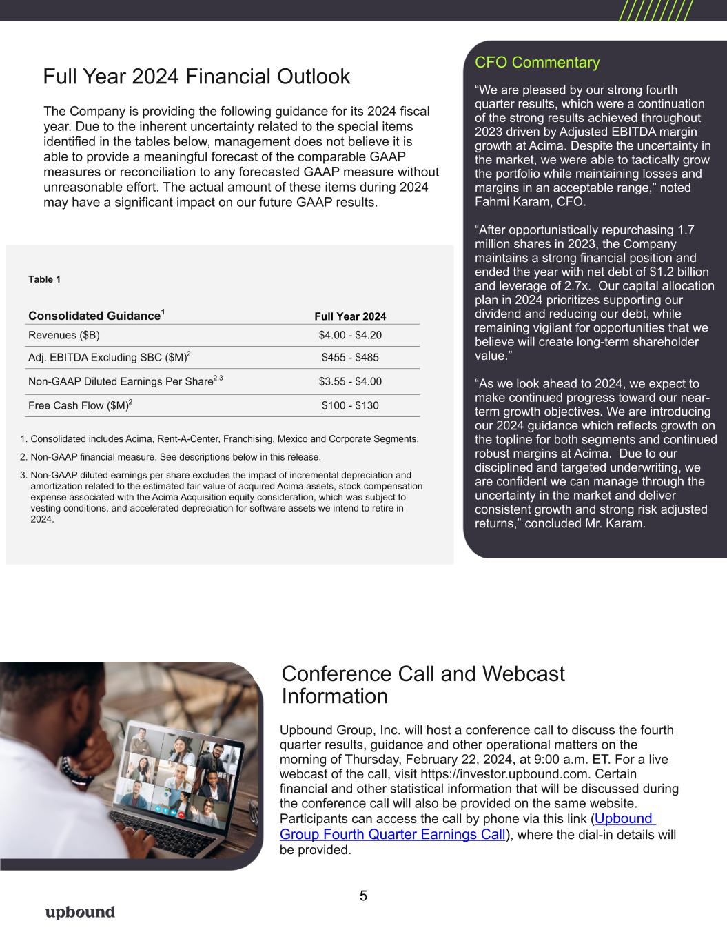 Full Year 2024 Financial Outlook The Company is providing the following guidance for its 2024 fiscal year. Due to the inherent uncertainty related to the special items identified in the tables below, management does not believe it is able to provide a meaningful forecast of the comparable GAAP measures or reconciliation to any forecasted GAAP measure without unreasonable effort. The actual amount of these items during 2024 may have a significant impact on our future GAAP results. Conference Call and Webcast Information Upbound Group, Inc. will host a conference call to discuss the fourth quarter results, guidance and other operational matters on the morning of Thursday, February 22, 2024, at 9:00 a.m. ET. For a live webcast of the call, visit https://investor.upbound.com. Certain financial and other statistical information that will be discussed during the conference call will also be provided on the same website. Participants can access the call by phone via this link (Upbound Group Fourth Quarter Earnings Call), where the dial-in details will be provided. Table 1 Full Year 2024Consolidated Guidance1 Revenues ($B) $4.00 - $4.20 Adj. EBITDA Excluding SBC ($M)2 $455 - $485 Non-GAAP Diluted Earnings Per Share2,3 $3.55 - $4.00 Free Cash Flow ($M)2 $100 - $130 1. Consolidated includes Acima, Rent-A-Center, Franchising, Mexico and Corporate Segments. 2. Non-GAAP financial measure. See descriptions below in this release. 3. Non-GAAP diluted earnings per share excludes the impact of incremental depreciation and amortization related to the estimated fair value of acquired Acima assets, stock compensation expense associated with the Acima Acquisition equity consideration, which was subject to vesting conditions, and accelerated depreciation for software assets we intend to retire in 2024. CFO Commentary “We are pleased by our strong fourth quarter results, which were a continuation of the strong results achieved throughout 2023 driven by Adjusted EBITDA margin growth at Acima. Despite the uncertainty in the market, we were able to tactically grow the portfolio while maintaining losses and margins in an acceptable range,” noted Fahmi Karam, CFO. “After opportunistically repurchasing 1.7 million shares in 2023, the Company maintains a strong financial position and ended the year with net debt of $1.2 billion and leverage of 2.7x. Our capital allocation plan in 2024 prioritizes supporting our dividend and reducing our debt, while remaining vigilant for opportunities that we believe will create long-term shareholder value.” “As we look ahead to 2024, we expect to make continued progress toward our near- term growth objectives. We are introducing our 2024 guidance which reflects growth on the topline for both segments and continued robust margins at Acima. Due to our disciplined and targeted underwriting, we are confident we can manage through the uncertainty in the market and deliver consistent growth and strong risk adjusted returns,” concluded Mr. Karam. 5