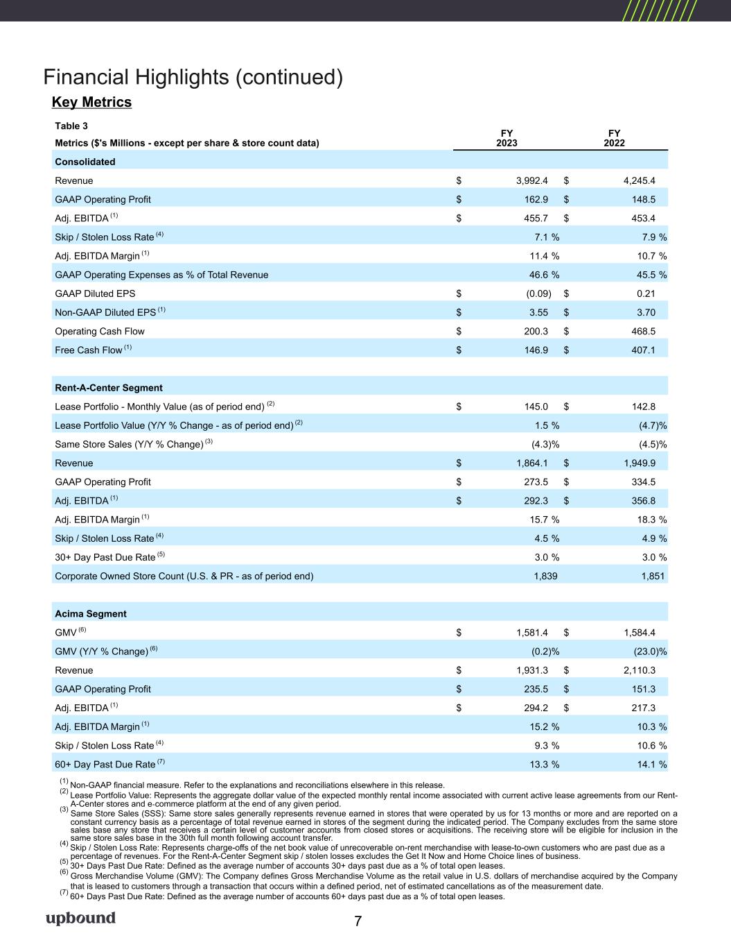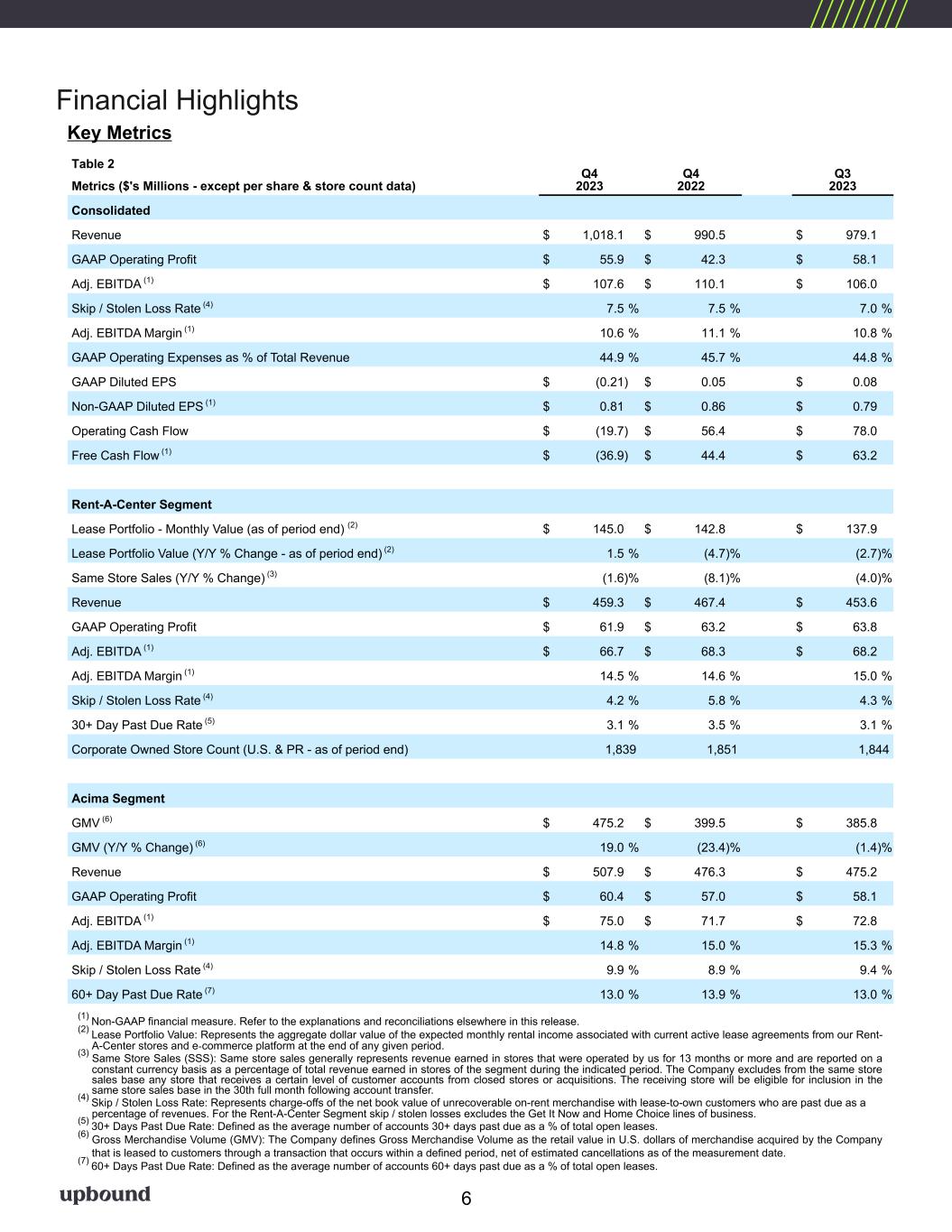Financial Highlights (1) Non-GAAP financial measure. Refer to the explanations and reconciliations elsewhere in this release. (2) Lease Portfolio Value: Represents the aggregate dollar value of the expected monthly rental income associated with current active lease agreements from our Rent- A-Center stores and e-commerce platform at the end of any given period. (3) Same Store Sales (SSS): Same store sales generally represents revenue earned in stores that were operated by us for 13 months or more and are reported on a constant currency basis as a percentage of total revenue earned in stores of the segment during the indicated period. The Company excludes from the same store sales base any store that receives a certain level of customer accounts from closed stores or acquisitions. The receiving store will be eligible for inclusion in the same store sales base in the 30th full month following account transfer. (4) Skip / Stolen Loss Rate: Represents charge-offs of the net book value of unrecoverable on-rent merchandise with lease-to-own customers who are past due as a percentage of revenues. For the Rent-A-Center Segment skip / stolen losses excludes the Get It Now and Home Choice lines of business. (5) 30+ Days Past Due Rate: Defined as the average number of accounts 30+ days past due as a % of total open leases. (6) Gross Merchandise Volume (GMV): The Company defines Gross Merchandise Volume as the retail value in U.S. dollars of merchandise acquired by the Company that is leased to customers through a transaction that occurs within a defined period, net of estimated cancellations as of the measurement date. (7) 60+ Days Past Due Rate: Defined as the average number of accounts 60+ days past due as a % of total open leases. Table 2 Q4 2023 Q4 2022 Q3 2023Metrics ($'s Millions - except per share & store count data) Consolidated Revenue $ 1,018.1 $ 990.5 $ 979.1 GAAP Operating Profit $ 55.9 $ 42.3 $ 58.1 Adj. EBITDA (1) $ 107.6 $ 110.1 $ 106.0 Skip / Stolen Loss Rate (4) 7.5 % 7.5 % 7.0 % Adj. EBITDA Margin (1) 10.6 % 11.1 % 10.8 % GAAP Operating Expenses as % of Total Revenue 44.9 % 45.7 % 44.8 % GAAP Diluted EPS $ (0.21) $ 0.05 $ 0.08 Non-GAAP Diluted EPS (1) $ 0.81 $ 0.86 $ 0.79 Operating Cash Flow $ (19.7) $ 56.4 $ 78.0 Free Cash Flow (1) $ (36.9) $ 44.4 $ 63.2 Rent-A-Center Segment Lease Portfolio - Monthly Value (as of period end) (2) $ 145.0 $ 142.8 $ 137.9 Lease Portfolio Value (Y/Y % Change - as of period end) (2) 1.5 % (4.7) % (2.7) % Same Store Sales (Y/Y % Change) (3) (1.6) % (8.1) % (4.0) % Revenue $ 459.3 $ 467.4 $ 453.6 GAAP Operating Profit $ 61.9 $ 63.2 $ 63.8 Adj. EBITDA (1) $ 66.7 $ 68.3 $ 68.2 Adj. EBITDA Margin (1) 14.5 % 14.6 % 15.0 % Skip / Stolen Loss Rate (4) 4.2 % 5.8 % 4.3 % 30+ Day Past Due Rate (5) 3.1 % 3.5 % 3.1 % Corporate Owned Store Count (U.S. & PR - as of period end) 1,839 1,851 1,844 Acima Segment GMV (6) $ 475.2 $ 399.5 $ 385.8 GMV (Y/Y % Change) (6) 19.0 % (23.4) % (1.4) % Revenue $ 507.9 $ 476.3 $ 475.2 GAAP Operating Profit $ 60.4 $ 57.0 $ 58.1 Adj. EBITDA (1) $ 75.0 $ 71.7 $ 72.8 Adj. EBITDA Margin (1) 14.8 % 15.0 % 15.3 % Skip / Stolen Loss Rate (4) 9.9 % 8.9 % 9.4 % 60+ Day Past Due Rate (7) 13.0 % 13.9 % 13.0 % Key Metrics 6