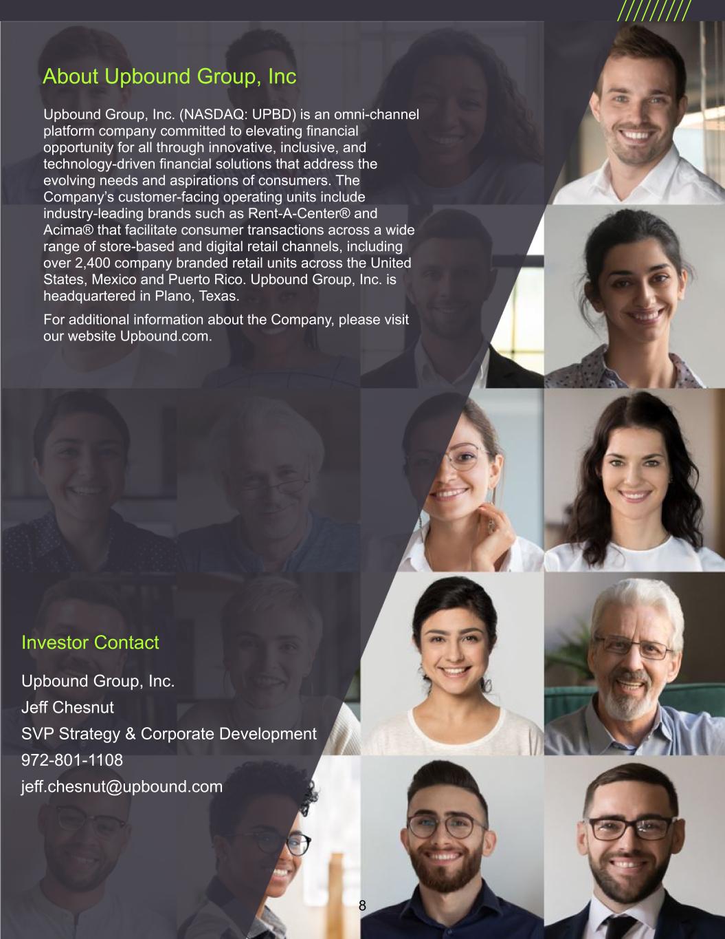 About Upbound Group, Inc Upbound Group, Inc. (NASDAQ: UPBD) is an omni-channel platform company committed to elevating financial opportunity for all through innovative, inclusive, and technology-driven financial solutions that address the evolving needs and aspirations of consumers. The Company’s customer-facing operating units include industry-leading brands such as Rent-A-Center® and Acima® that facilitate consumer transactions across a wide range of store-based and digital retail channels, including over 2,400 company branded retail units across the United States, Mexico and Puerto Rico. Upbound Group, Inc. is headquartered in Plano, Texas. For additional information about the Company, please visit our website Upbound.com. Investor Contact Upbound Group, Inc. Jeff Chesnut SVP Strategy & Corporate Development 972-801-1108 jeff.chesnut@upbound.com 8