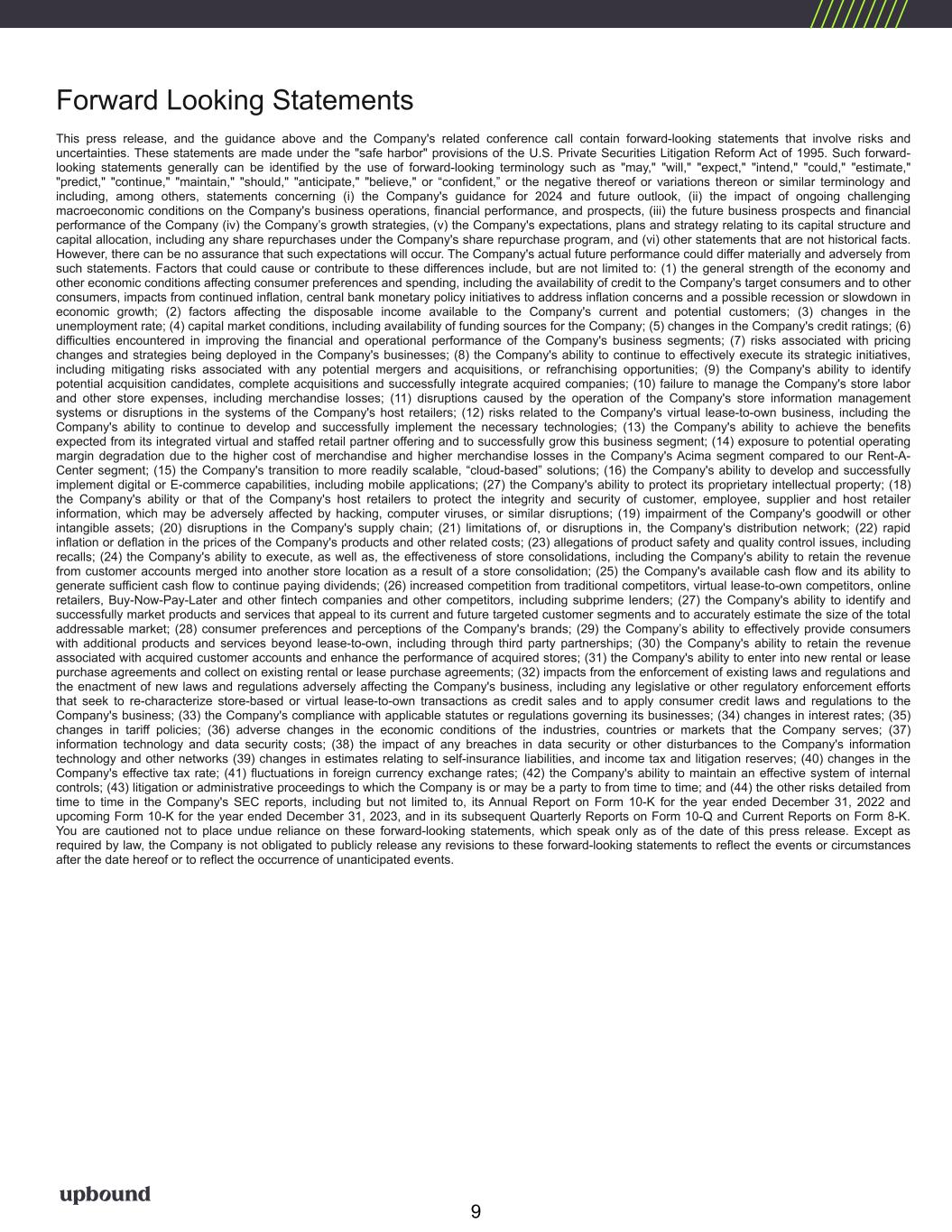 Forward Looking Statements This press release, and the guidance above and the Company's related conference call contain forward-looking statements that involve risks and uncertainties. These statements are made under the "safe harbor" provisions of the U.S. Private Securities Litigation Reform Act of 1995. Such forward- looking statements generally can be identified by the use of forward-looking terminology such as "may," "will," "expect," "intend," "could," "estimate," "predict," "continue," "maintain," "should," "anticipate," "believe," or “confident,” or the negative thereof or variations thereon or similar terminology and including, among others, statements concerning (i) the Company's guidance for 2024 and future outlook, (ii) the impact of ongoing challenging macroeconomic conditions on the Company's business operations, financial performance, and prospects, (iii) the future business prospects and financial performance of the Company (iv) the Company’s growth strategies, (v) the Company's expectations, plans and strategy relating to its capital structure and capital allocation, including any share repurchases under the Company's share repurchase program, and (vi) other statements that are not historical facts. However, there can be no assurance that such expectations will occur. The Company's actual future performance could differ materially and adversely from such statements. Factors that could cause or contribute to these differences include, but are not limited to: (1) the general strength of the economy and other economic conditions affecting consumer preferences and spending, including the availability of credit to the Company's target consumers and to other consumers, impacts from continued inflation, central bank monetary policy initiatives to address inflation concerns and a possible recession or slowdown in economic growth; (2) factors affecting the disposable income available to the Company's current and potential customers; (3) changes in the unemployment rate; (4) capital market conditions, including availability of funding sources for the Company; (5) changes in the Company's credit ratings; (6) difficulties encountered in improving the financial and operational performance of the Company's business segments; (7) risks associated with pricing changes and strategies being deployed in the Company's businesses; (8) the Company's ability to continue to effectively execute its strategic initiatives, including mitigating risks associated with any potential mergers and acquisitions, or refranchising opportunities; (9) the Company's ability to identify potential acquisition candidates, complete acquisitions and successfully integrate acquired companies; (10) failure to manage the Company's store labor and other store expenses, including merchandise losses; (11) disruptions caused by the operation of the Company's store information management systems or disruptions in the systems of the Company's host retailers; (12) risks related to the Company's virtual lease-to-own business, including the Company's ability to continue to develop and successfully implement the necessary technologies; (13) the Company's ability to achieve the benefits expected from its integrated virtual and staffed retail partner offering and to successfully grow this business segment; (14) exposure to potential operating margin degradation due to the higher cost of merchandise and higher merchandise losses in the Company's Acima segment compared to our Rent-A- Center segment; (15) the Company's transition to more readily scalable, “cloud-based” solutions; (16) the Company's ability to develop and successfully implement digital or E-commerce capabilities, including mobile applications; (27) the Company's ability to protect its proprietary intellectual property; (18) the Company's ability or that of the Company's host retailers to protect the integrity and security of customer, employee, supplier and host retailer information, which may be adversely affected by hacking, computer viruses, or similar disruptions; (19) impairment of the Company's goodwill or other intangible assets; (20) disruptions in the Company's supply chain; (21) limitations of, or disruptions in, the Company's distribution network; (22) rapid inflation or deflation in the prices of the Company's products and other related costs; (23) allegations of product safety and quality control issues, including recalls; (24) the Company's ability to execute, as well as, the effectiveness of store consolidations, including the Company's ability to retain the revenue from customer accounts merged into another store location as a result of a store consolidation; (25) the Company's available cash flow and its ability to generate sufficient cash flow to continue paying dividends; (26) increased competition from traditional competitors, virtual lease-to-own competitors, online retailers, Buy-Now-Pay-Later and other fintech companies and other competitors, including subprime lenders; (27) the Company's ability to identify and successfully market products and services that appeal to its current and future targeted customer segments and to accurately estimate the size of the total addressable market; (28) consumer preferences and perceptions of the Company's brands; (29) the Company’s ability to effectively provide consumers with additional products and services beyond lease-to-own, including through third party partnerships; (30) the Company's ability to retain the revenue associated with acquired customer accounts and enhance the performance of acquired stores; (31) the Company's ability to enter into new rental or lease purchase agreements and collect on existing rental or lease purchase agreements; (32) impacts from the enforcement of existing laws and regulations and the enactment of new laws and regulations adversely affecting the Company's business, including any legislative or other regulatory enforcement efforts that seek to re-characteriz