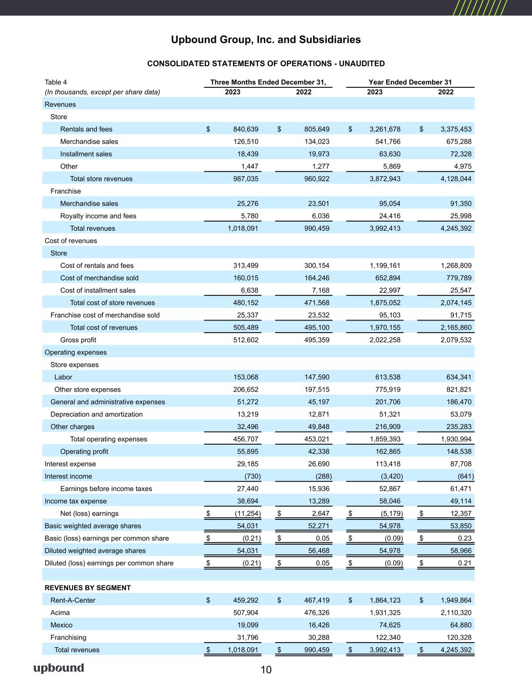 Upbound Group, Inc. and Subsidiaries CONSOLIDATED STATEMENTS OF OPERATIONS - UNAUDITED Table 4 Three Months Ended December 31, Year Ended December 31 (In thousands, except per share data) 2023 2022 2023 2022 Revenues Store Rentals and fees $ 840,639 $ 805,649 $ 3,261,678 $ 3,375,453 Merchandise sales 126,510 134,023 541,766 675,288 Installment sales 18,439 19,973 63,630 72,328 Other 1,447 1,277 5,869 4,975 Total store revenues 987,035 960,922 3,872,943 4,128,044 Franchise Merchandise sales 25,276 23,501 95,054 91,350 Royalty income and fees 5,780 6,036 24,416 25,998 Total revenues 1,018,091 990,459 3,992,413 4,245,392 Cost of revenues Store Cost of rentals and fees 313,499 300,154 1,199,161 1,268,809 Cost of merchandise sold 160,015 164,246 652,894 779,789 Cost of installment sales 6,638 7,168 22,997 25,547 Total cost of store revenues 480,152 471,568 1,875,052 2,074,145 Franchise cost of merchandise sold 25,337 23,532 95,103 91,715 Total cost of revenues 505,489 495,100 1,970,155 2,165,860 Gross profit 512,602 495,359 2,022,258 2,079,532 Operating expenses Store expenses Labor 153,068 147,590 613,538 634,341 Other store expenses 206,652 197,515 775,919 821,821 General and administrative expenses 51,272 45,197 201,706 186,470 Depreciation and amortization 13,219 12,871 51,321 53,079 Other charges 32,496 49,848 216,909 235,283 Total operating expenses 456,707 453,021 1,859,393 1,930,994 Operating profit 55,895 42,338 162,865 148,538 Interest expense 29,185 26,690 113,418 87,708 Interest income (730) (288) (3,420) (641) Earnings before income taxes 27,440 15,936 52,867 61,471 Income tax expense 38,694 13,289 58,046 49,114 Net (loss) earnings $ (11,254) $ 2,647 $ (5,179) $ 12,357 Basic weighted average shares 54,031 52,271 54,978 53,850 Basic (loss) earnings per common share $ (0.21) $ 0.05 $ (0.09) $ 0.23 Diluted weighted average shares 54,031 56,468 54,978 58,966 Diluted (loss) earnings per common share $ (0.21) $ 0.05 $ (0.09) $ 0.21 REVENUES BY SEGMENT Rent-A-Center $ 459,292 $ 467,419 $ 1,864,123 $ 1,949,864 Acima 507,904 476,326 1,931,325 2,110,320 Mexico 19,099 16,426 74,625 64,880 Franchising 31,796 30,288 122,340 120,328 Total revenues $ 1,018,091 $ 990,459 $ 3,992,413 $ 4,245,392 10