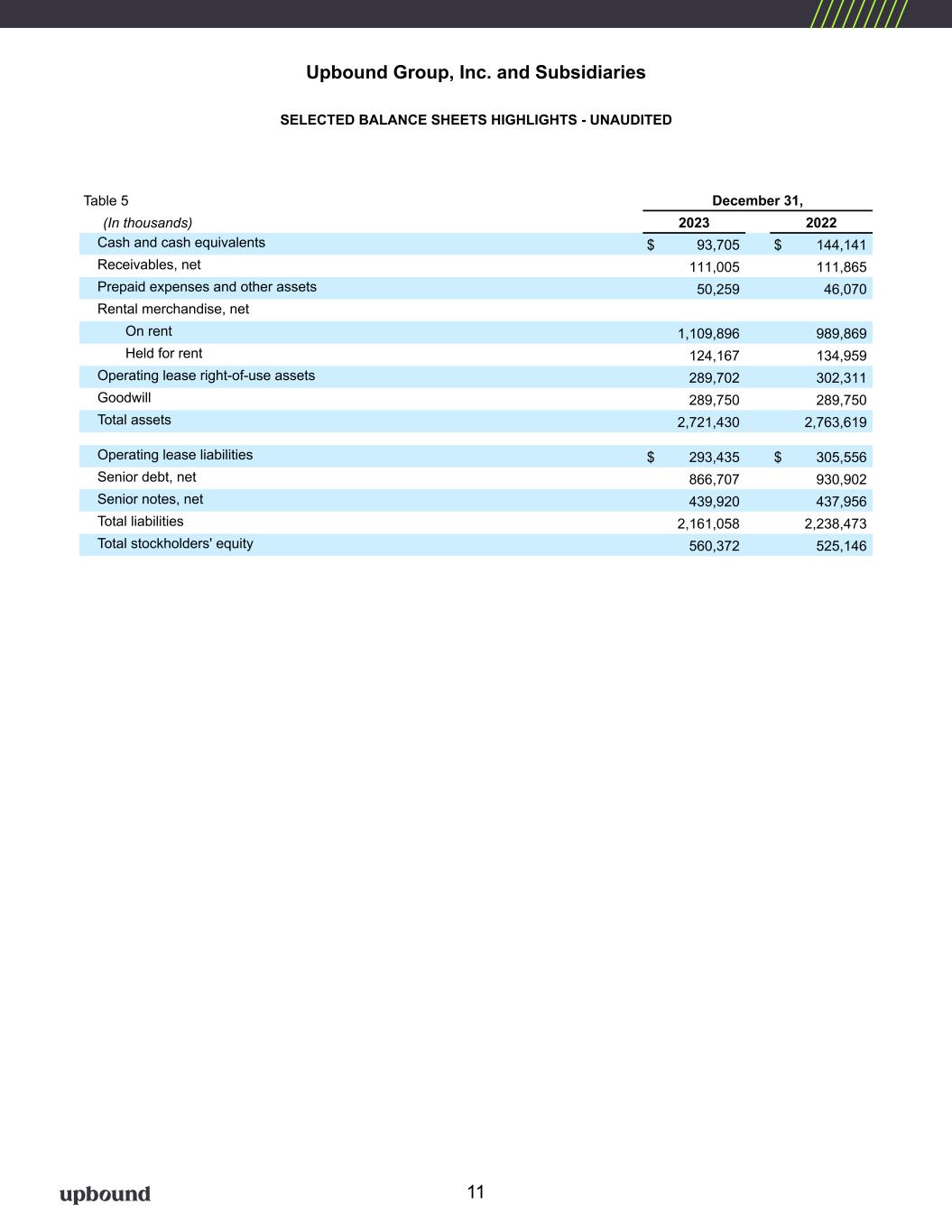 Upbound Group, Inc. and Subsidiaries SELECTED BALANCE SHEETS HIGHLIGHTS - UNAUDITED Table 5 December 31, (In thousands) 2023 2022 Cash and cash equivalents $ 93,705 $ 144,141 Receivables, net 111,005 111,865 Prepaid expenses and other assets 50,259 46,070 Rental merchandise, net On rent 1,109,896 989,869 Held for rent 124,167 134,959 Operating lease right-of-use assets 289,702 302,311 Goodwill 289,750 289,750 Total assets 2,721,430 2,763,619 Operating lease liabilities $ 293,435 $ 305,556 Senior debt, net 866,707 930,902 Senior notes, net 439,920 437,956 Total liabilities 2,161,058 2,238,473 Total stockholders' equity 560,372 525,146 11