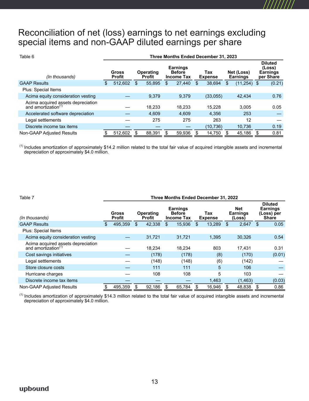 Reconciliation of net (loss) earnings to net earnings excluding special items and non-GAAP diluted earnings per share Table 6 Three Months Ended December 31, 2023 (In thousands) Gross Profit Operating Profit Earnings Before Income Tax Tax Expense Net (Loss) Earnings Diluted (Loss) Earnings per Share GAAP Results $ 512,602 $ 55,895 $ 27,440 $ 38,694 $ (11,254) $ (0.21) Plus: Special Items Acima equity consideration vesting — 9,379 9,379 (33,055) 42,434 0.76 Acima acquired assets depreciation and amortization(1) — 18,233 18,233 15,228 3,005 0.05 Accelerated software depreciation — 4,609 4,609 4,356 253 — Legal settlements — 275 275 263 12 — Discrete income tax items — — — (10,736) 10,736 0.19 Non-GAAP Adjusted Results $ 512,602 $ 88,391 $ 59,936 $ 14,750 $ 45,186 $ 0.81 (1) Includes amortization of approximately $14.2 million related to the total fair value of acquired intangible assets and incremental depreciation of approximately $4.0 million. Table 7 Three Months Ended December 31, 2022 (In thousands) Gross Profit Operating Profit Earnings Before Income Tax Tax Expense Net Earnings (Loss) Diluted Earnings (Loss) per Share GAAP Results $ 495,359 $ 42,338 $ 15,936 $ 13,289 $ 2,647 $ 0.05 Plus: Special Items Acima equity consideration vesting — 31,721 31,721 1,395 30,326 0.54 Acima acquired assets depreciation and amortization(1) — 18,234 18,234 803 17,431 0.31 Cost savings initiatives — (178) (178) (8) (170) (0.01) Legal settlements — (148) (148) (6) (142) — Store closure costs — 111 111 5 106 — Hurricane charges — 108 108 5 103 — Discrete income tax items — — — 1,463 (1,463) (0.03) Non-GAAP Adjusted Results $ 495,359 $ 92,186 $ 65,784 $ 16,946 $ 48,838 $ 0.86 (1) Includes amortization of approximately $14.3 million related to the total fair value of acquired intangible assets and incremental depreciation of approximately $4.0 million. 13