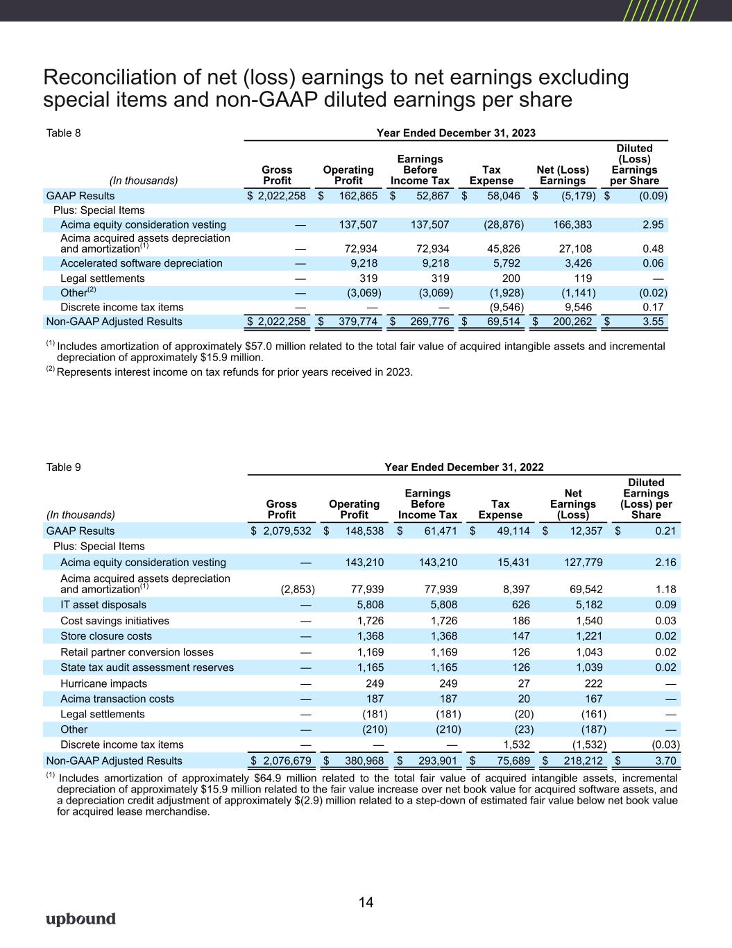 Reconciliation of net (loss) earnings to net earnings excluding special items and non-GAAP diluted earnings per share Table 8 Year Ended December 31, 2023 (In thousands) Gross Profit Operating Profit Earnings Before Income Tax Tax Expense Net (Loss) Earnings Diluted (Loss) Earnings per Share GAAP Results $ 2,022,258 $ 162,865 $ 52,867 $ 58,046 $ (5,179) $ (0.09) Plus: Special Items Acima equity consideration vesting — 137,507 137,507 (28,876) 166,383 2.95 Acima acquired assets depreciation and amortization(1) — 72,934 72,934 45,826 27,108 0.48 Accelerated software depreciation — 9,218 9,218 5,792 3,426 0.06 Legal settlements — 319 319 200 119 — Other(2) — (3,069) (3,069) (1,928) (1,141) (0.02) Discrete income tax items — — — (9,546) 9,546 0.17 Non-GAAP Adjusted Results $ 2,022,258 $ 379,774 $ 269,776 $ 69,514 $ 200,262 $ 3.55 (1) Includes amortization of approximately $57.0 million related to the total fair value of acquired intangible assets and incremental depreciation of approximately $15.9 million. (2) Represents interest income on tax refunds for prior years received in 2023. Table 9 Year Ended December 31, 2022 (In thousands) Gross Profit Operating Profit Earnings Before Income Tax Tax Expense Net Earnings (Loss) Diluted Earnings (Loss) per Share GAAP Results $ 2,079,532 $ 148,538 $ 61,471 $ 49,114 $ 12,357 $ 0.21 Plus: Special Items Acima equity consideration vesting — 143,210 143,210 15,431 127,779 2.16 Acima acquired assets depreciation and amortization(1) (2,853) 77,939 77,939 8,397 69,542 1.18 IT asset disposals — 5,808 5,808 626 5,182 0.09 Cost savings initiatives — 1,726 1,726 186 1,540 0.03 Store closure costs — 1,368 1,368 147 1,221 0.02 Retail partner conversion losses — 1,169 1,169 126 1,043 0.02 State tax audit assessment reserves — 1,165 1,165 126 1,039 0.02 Hurricane impacts — 249 249 27 222 — Acima transaction costs — 187 187 20 167 — Legal settlements — (181) (181) (20) (161) — Other — (210) (210) (23) (187) — Discrete income tax items — — — 1,532 (1,532) (0.03) Non-GAAP Adjusted Results $ 2,076,679 $ 380,968 $ 293,901 $ 75,689 $ 218,212 $ 3.70 (1) Includes amortization of approximately $64.9 million related to the total fair value of acquired intangible assets, incremental depreciation of approximately $15.9 million related to the fair value increase over net book value for acquired software assets, and a depreciation credit adjustment of approximately $(2.9) million related to a step-down of estimated fair value below net book value for acquired lease merchandise. 14