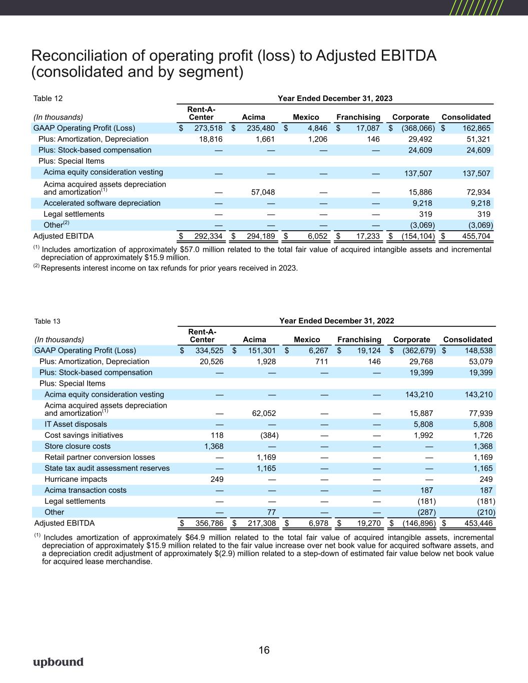 Reconciliation of operating profit (loss) to Adjusted EBITDA (consolidated and by segment) Table 12 Year Ended December 31, 2023 (In thousands) Rent-A- Center Acima Mexico Franchising Corporate Consolidated GAAP Operating Profit (Loss) $ 273,518 $ 235,480 $ 4,846 $ 17,087 $ (368,066) $ 162,865 Plus: Amortization, Depreciation 18,816 1,661 1,206 146 29,492 51,321 Plus: Stock-based compensation — — — — 24,609 24,609 Plus: Special Items Acima equity consideration vesting — — — — 137,507 137,507 Acima acquired assets depreciation and amortization(1) — 57,048 — — 15,886 72,934 Accelerated software depreciation — — — — 9,218 9,218 Legal settlements — — — — 319 319 Other(2) — — — — (3,069) (3,069) Adjusted EBITDA $ 292,334 $ 294,189 $ 6,052 $ 17,233 $ (154,104) $ 455,704 (1) Includes amortization of approximately $57.0 million related to the total fair value of acquired intangible assets and incremental depreciation of approximately $15.9 million. (2) Represents interest income on tax refunds for prior years received in 2023. Table 13 Year Ended December 31, 2022 (In thousands) Rent-A- Center Acima Mexico Franchising Corporate Consolidated GAAP Operating Profit (Loss) $ 334,525 $ 151,301 $ 6,267 $ 19,124 $ (362,679) $ 148,538 Plus: Amortization, Depreciation 20,526 1,928 711 146 29,768 53,079 Plus: Stock-based compensation — — — — 19,399 19,399 Plus: Special Items Acima equity consideration vesting — — — — 143,210 143,210 Acima acquired assets depreciation and amortization(1) — 62,052 — — 15,887 77,939 IT Asset disposals — — — — 5,808 5,808 Cost savings initiatives 118 (384) — — 1,992 1,726 Store closure costs 1,368 — — — — 1,368 Retail partner conversion losses — 1,169 — — — 1,169 State tax audit assessment reserves — 1,165 — — — 1,165 Hurricane impacts 249 — — — — 249 Acima transaction costs — — — — 187 187 Legal settlements — — — — (181) (181) Other — 77 — — (287) (210) Adjusted EBITDA $ 356,786 $ 217,308 $ 6,978 $ 19,270 $ (146,896) $ 453,446 (1) Includes amortization of approximately $64.9 million related to the total fair value of acquired intangible assets, incremental depreciation of approximately $15.9 million related to the fair value increase over net book value for acquired software assets, and a depreciation credit adjustment of approximately $(2.9) million related to a step-down of estimated fair value below net book value for acquired lease merchandise. 16