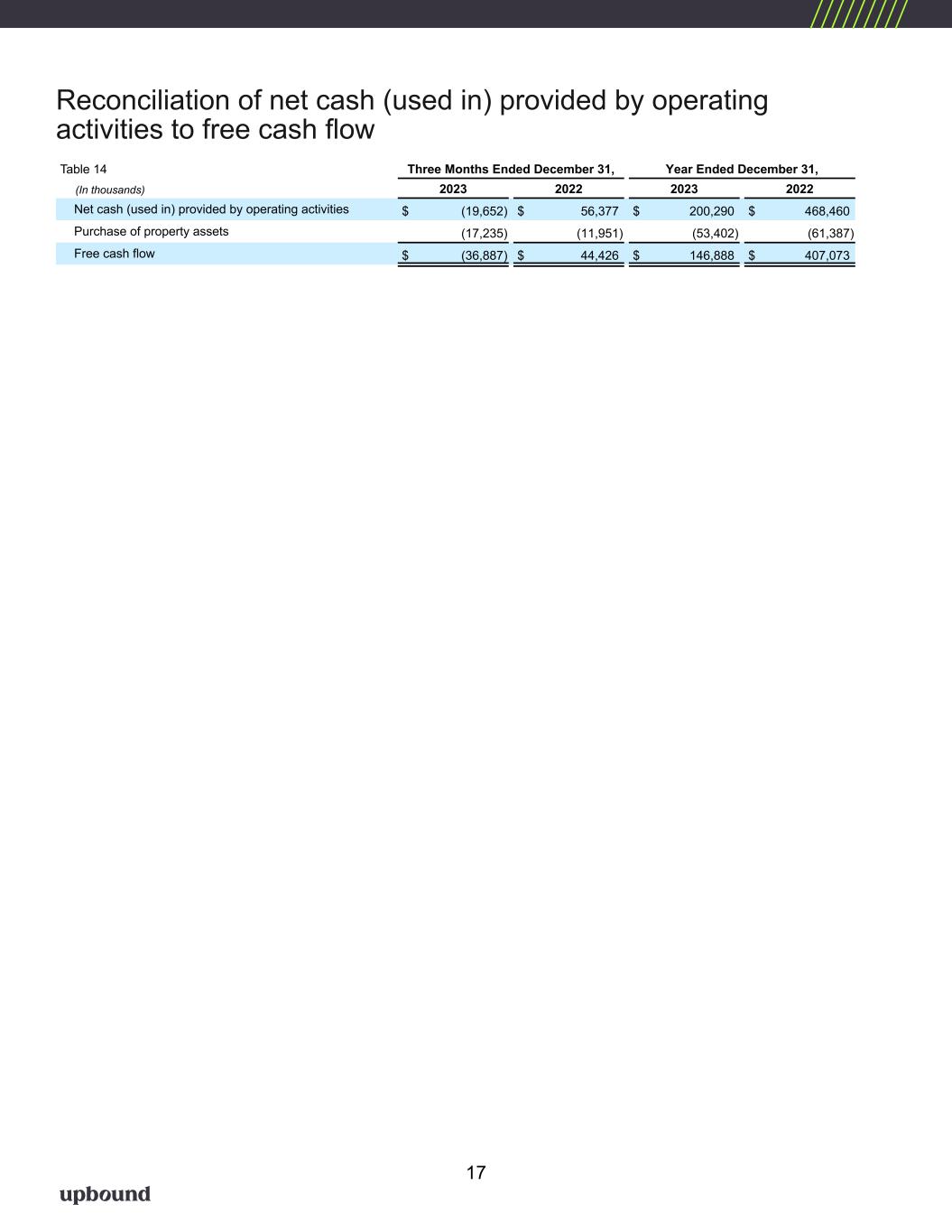 Reconciliation of net cash (used in) provided by operating activities to free cash flow Table 14 Three Months Ended December 31, Year Ended December 31, (In thousands) 2023 2022 2023 2022 Net cash (used in) provided by operating activities $ (19,652) $ 56,377 $ 200,290 $ 468,460 Purchase of property assets (17,235) (11,951) (53,402) (61,387) Free cash flow $ (36,887) $ 44,426 $ 146,888 $ 407,073 17