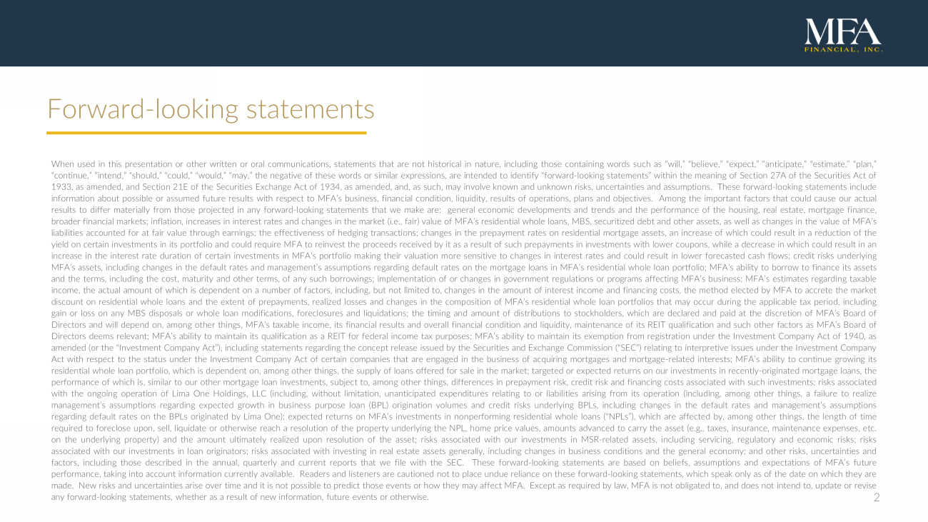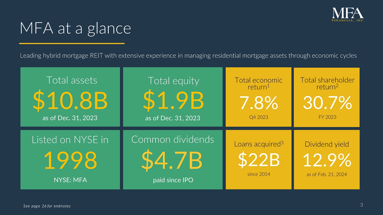 2 Q3 202 2 Financial Snapshot Forward - looking statements When used in this presentation or other written or oral communications, statements that are not historical in nature, including those containing words such as “will,” “believe,” “expect,” “anticipate,” “estimate,” “plan,” “continue,” “intend,” “should,” “could,” “would,” “may,” the negative of these words or similar expressions, are intended to identify “forward - looking statements” within the meaning of Section 27 A of the Securities Act of 1933 , as amended, and Section 21 E of the Securities Exchange Act of 1934 , as amended, and, as such, may involve known and unknown risks, uncertainties and assumptions . These forward - looking statements include information about possible or assumed future results with respect to MFA’s business, financial condition, liquidity, results of operations, plans and objectives . Among the important factors that could cause our actual results to differ materially from those projected in any forward - looking statements that we make are : general economic developments and trends and the performance of the housing, real estate, mortgage finance, broader financial markets ; inflation, increases in interest rates and changes in the market (i . e . , fair) value of MFA’s residential whole loans, MBS, securitized debt and other assets, as well as changes in the value of MFA’s liabilities accounted for at fair value through earnings ; the effectiveness of hedging transactions ; changes in the prepayment rates on residential mortgage assets, an increase of which could result in a reduction of the yield on certain investments in its portfolio and could require MFA to reinvest the proceeds received by it as a result of such prepayments in investments with lower coupons, while a decrease in which could result in an increase in the interest rate duration of certain investments in MFA’s portfolio making their valuation more sensitive to changes in interest rates and could result in lower forecasted cash flows ; credit risks underlying MFA’s assets, including changes in the default rates and management’s assumptions regarding default rates on the mortgage loans in MFA’s residential whole loan portfolio ; MFA’s ability to borrow to finance its assets and the terms, including the cost, maturity and other terms, of any such borrowings ; implementation of or changes in government regulations or programs affecting MFA’s business ; MFA’s estimates regarding taxable income, the actual amount of which is dependent on a number of factors, including, but not limited to, changes in the amount of interest income and financing costs, the method elected by MFA to accrete the market discount on residential whole loans and the extent of prepayments, realized losses and changes in the composition of MFA’s residential whole loan portfolios that may occur during the applicable tax period, including gain or loss on any MBS disposals or whole loan modifications, foreclosures and liquidations ; the timing and amount of distributions to stockholders, which are declared and paid at the discretion of MFA’s Board of Directors and will depend on, among other things, MFA’s taxable income, its financial results and overall financial condition and liquidity, maintenance of its REIT qualification and such other factors as MFA’s Board of Directors deems relevant ; MFA’s ability to maintain its qualification as a REIT for federal income tax purposes ; MFA’s ability to maintain its exemption from registration under the Investment Company Act of 1940 , as amended (or the “Investment Company Act”), including statements regarding the concept release issued by the Securities and Exchange Commission (“SEC”) relating to interpretive issues under the Investment Company Act with respect to the status under the Investment Company Act of certain companies that are engaged in the business of acquiring mortgages and mortgage - related interests ; MFA’s ability to continue growing its residential whole loan portfolio, which is dependent on, among other things, the supply of loans offered for sale in the market ; targeted or expected returns on our investments in recently - originated mortgage loans, the performance of which is, similar to our other mortgage loan investments, subject to, among other things, differences in prepayment risk, credit risk and financing costs associated with such investments ; risks associated with the ongoing operation of Lima One Holdings, LLC (including, without limitation, unanticipated expenditures relating to or liabilities arising from its operation (including, among other things, a failure to realize management’s assumptions regarding expected growth in business purpose loan (BPL) origination volumes and credit risks underlying BPLs, including changes in the default rates and management’s assumptions regarding default rates on the BPLs originated by Lima One) ; expected returns on MFA’s investments in nonperforming residential whole loans (“NPLs”), which are affected by, among other things, the length of time required to foreclose upon, sell, liquidate or otherwise reach a resolution of the property underlying the NPL, home price values, amounts advanced to carry the asset (e . g . , taxes, insurance, maintenance expenses, etc . on the underlying property) and the amount ultimately realized upon resolution of the asset ; risks associated with our investments in MSR - related assets, including servicing, regulatory and economic risks ; risks associated with our investments in loan originators ; risks associated with investing in real estate assets generally, including changes in business conditions and the general economy ; and other risks, uncertainties and factors, including those described in the annual, quarterly and current reports that we file with the SEC . These forward - looking statements are based on beliefs, 