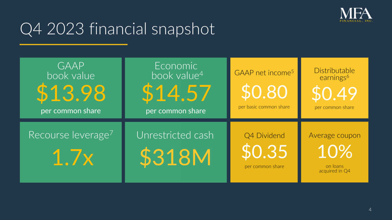 3 MFA at a glance 3 $1.9B Total equity 1998 Listed on NYSE in Leading hybrid mortgage REIT with extensive experience in managing residential mortgage assets through economic cycles $10.8B Total assets NYSE: MFA $4.7B Common dividends as of Dec. 31, 2023 as of Dec. 31, 2023 paid since IPO Dividend yield 13% as of Feb. 20, 2024 Loans acquired 3 $22B since 2014 Total shareholder return 2 30.7% FY 2023 Total economic return 1 7.8% Q4 2023 See page 26 for endnotes