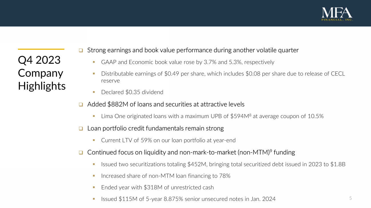 4 Q 4 202 3 financial snapshot $13.98 $14.57 GAAP net income 5 $0.80 per basic common share Distributable earnings 6 $0.49 per common share GAAP book value Economic book value 4 per common share per common share $318M Unrestricted cash 1.7x Recourse leverage 7 4 Q4 Dividend $0.35 per common share Average coupon 10% on loans acquired in Q4