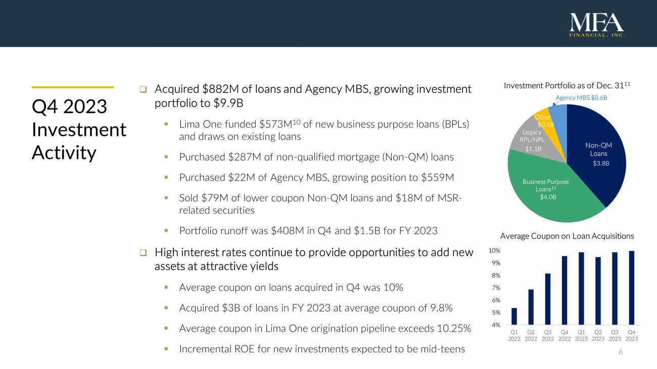 5 Q4 2023 Company Highlights □ Strong earnings and book value performance during another volatile quarter ▪ GAAP and Economic book value rose by 3.7% and 5.3%, respectively ▪ Distributable earnings of $0.49 per share, which includes $0.08 per share due to release of CECL reserve ▪ Declared $0.35 dividend □ Added $882M of loans and securities at attractive levels ▪ Lima One originated loans with a maximum UPB of $594M 8 at average coupon of 10.5% □ Loan portfolio credit fundamentals remain strong ▪ Current LTV of 59% on our loan portfolio at year - end □ Continued focus on liquidity and non - mark - to - market (non - MTM) 9 funding ▪ Issued two securitizations totaling $452M, bringing total securitized debt issued in 2023 to $1.8B ▪ Increased share of non - MTM loan financing to 78% ▪ Ended year with $318M of unrestricted cash ▪ Issued $115M of 5 - year 8.875% senior unsecured notes in Jan. 2024