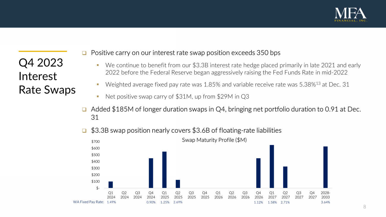 7 Q4 2023 Liability Highlights □ Our borrowing costs have been relatively stable due to fixed - rate securitizations and interest rate swaps ▪ Effective cost of funds in Q4 was 4.33% and 4.11% for FY 2023 □ Issued $452M of securitized term debt in Q4 ▪ Collateralized by $520M UPB of Non - QM and Transitional loans ▪ 72% of our asset - based financing is non - MTM ▪ Issued additional securitization collateralized by $193M UPB of Transitional loans in Feb. 2024 □ Overall leverage was 4.5x and recourse leverage was 1.7x at Dec. 31 ▪ $2.4B of unused financing capacity across all loan product types □ Repurchased $10M of convertible notes and additional $40M so far in 2024 ▪ Outstanding balance is less than $170M as of Feb. 21 □ Issued $115M of 5 - Year 8.875% senior unsecured notes in Jan. 2024 MTM Warehouse Line Non - MTM Warehouse Line Non - MTM Securitized Debt Other $2.4B MTM $0.0 $1.0 $2.0 $3.0 $4.0 $5.0 $6.0 $7.0 $8.0 $9.0 Liabilities ($B) as of Dec. 31 Agency Repo MTM Warehouse Lines Non - MTM Warehouse Lines Non - MTM Securitized Debt Other $6.5B Non - MTM