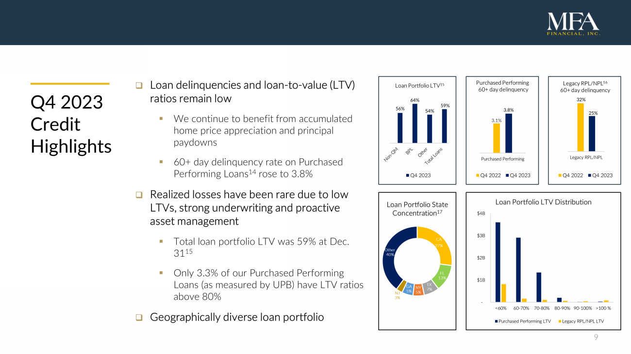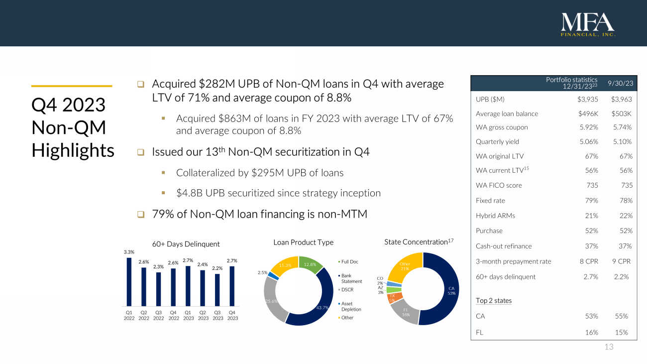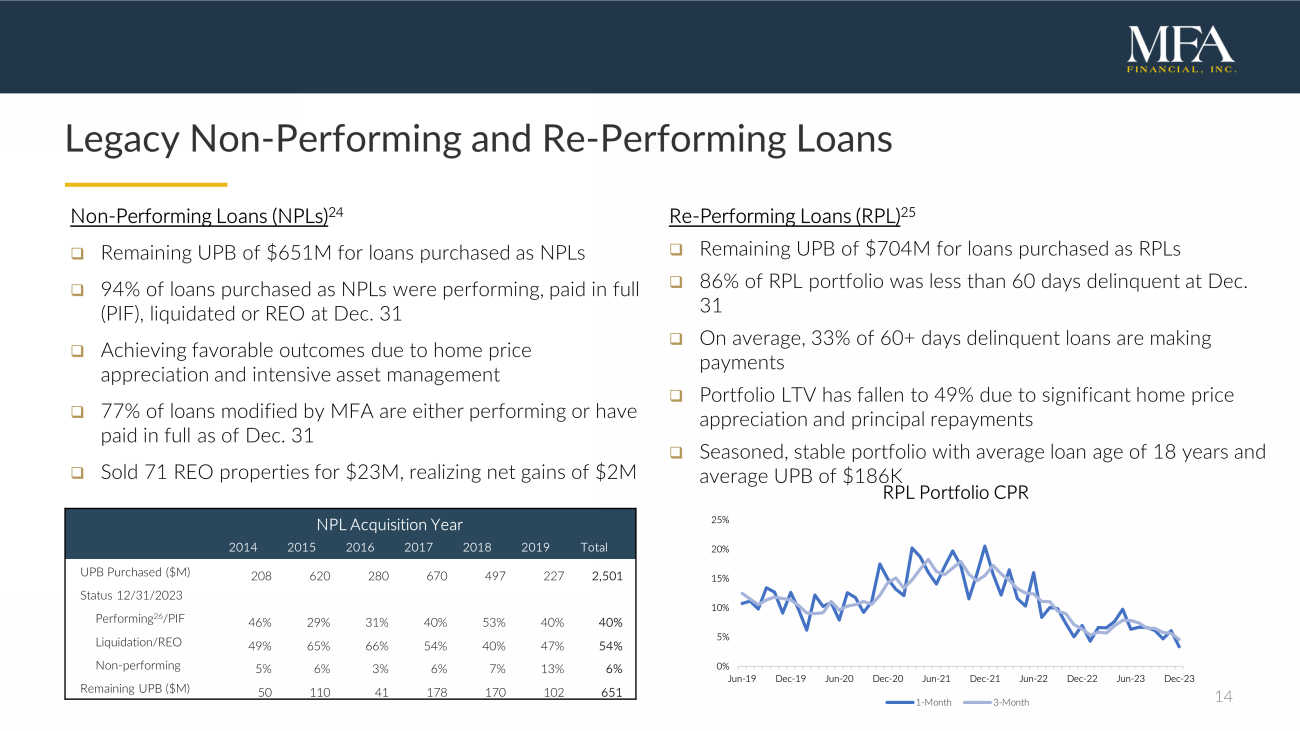 13 Q4 2023 Non - QM Highlights □ Acquired $282M UPB of Non - QM loans in Q4 with average LTV of 71% and average coupon of 8.8% ▪ Acquired $863M of loans in FY 2023 with average LTV of 67% and average coupon of 8.8% □ Issued our 13 th Non - QM securitization in Q4 ▪ Collateralized by $295M UPB of loans ▪ $4.8B UPB securitized since strategy inception □ 79% of Non - QM loan financing is non - MTM CA 53% FL 16% TX 5% AZ 3% CO 2% Other 21% State Concentration 17 12.8% 43.7% 25.6% 2.5% 15.3% Loan Product Type Full Doc Bank Statement DSCR Asset Depletion Other 3.3% 2.6% 2.3% 2.6% 2.7% 2.4% 2.2% 2.7% Q1 2022 Q2 2022 Q3 2022 Q4 2022 Q1 2023 Q2 2023 Q3 2023 Q4 2023 60+ Days Delinquent P ortfolio s tatistics 12/31/23 23 9/30/23 UPB ($M) $3,935 $3,963 Average loan balance $496K $503K WA gross coupon 5.92% 5.74% Quarterly yield 5.06% 5.10% WA original LTV 67% 67% WA current LTV 15 56% 56% WA FICO score 735 735 Fixed rate 79% 78% Hybrid ARMs 21% 22% Purchase 52% 52% Cash - out refinance 37% 37% 3 - month prepayment rate 8 CPR 9 CPR 60+ days delinquent 2.7% 2.2% Top 2 states CA 53% 55% FL 16% 15%