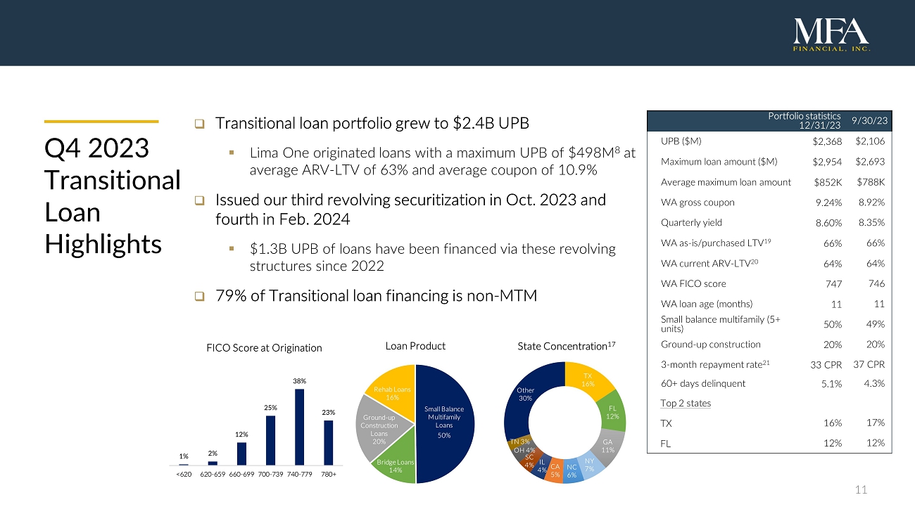 10 □ Strong origination volume in Q4 and FY 2023 ▪ $594M of originations 8 in Q4 with average LTV 18 of 64% and FICO score of 749 ▪ $2.3B originated in 2023, exceeding $2B for second consecutive year ▪ Origination fees, servicing fees and other fee income totaled $10.8M □ Lima has originated $5.6B 8 of BPLs for our balance sheet since our acquisition in 2021 ▪ Lima offers a broad range of loan products to real estate investors nationwide including rehab loans, bridge loans, construction loans, rental loans and small - balance multifamily loans ▪ Credit performance remains strong with 60+ day delinquency rate of 3.9% for our BPLs originated by Lima One Q4 2023 Lima One Highlights $- $1.0 $2.0 $3.0 $4.0 $5.0 $6.0 Q3 2021 Q4 2021 Q1 2022 Q2 2022 Q3 2022 Q4 2022 Q1 2023 Q2 2023 Q3 2023 Q4 2023 Origination UPB ($B) Lima One Origination Volume Since Acquisition 8 6.38% 5.38% 6.13% 5.70% 6.09% 6.58% 6.62% 6.88% 7.21% 7.45% Q3 2021 Q4 2021 Q1 2022 Q2 2022 Q3 2022 Q4 2022 Q1 2023 Q2 2023 Q3 2023 Q4 2023 BPL Portfolio Yield