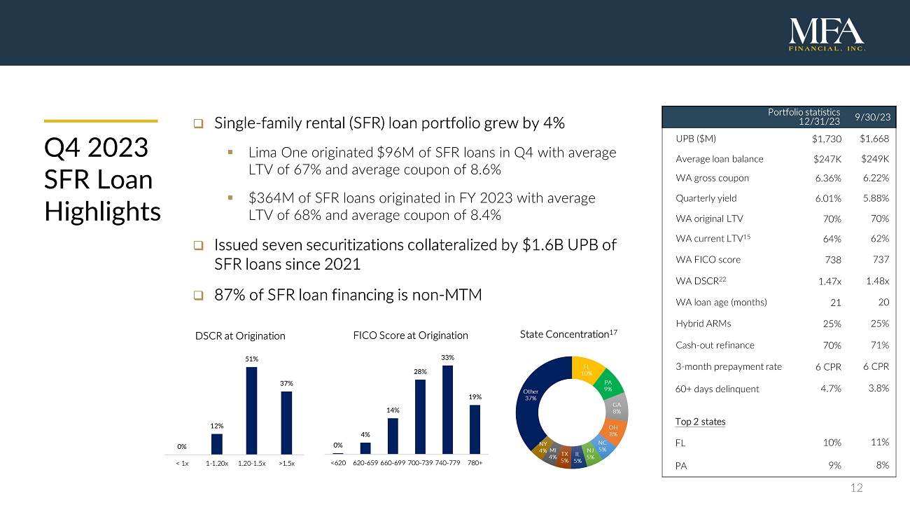 11 Portfolio s tatistics 12/31/23 9/30/23 UPB ($M) $2,368 $2,106 Maximum loan amount ($M) $2,954 $2,693 Average maximum loan amount $852K $788K WA gross coupon 9.24% 8.92% Quarterly yield 8.60% 8.35% WA as - is/purchased LTV 19 66% 66% WA current ARV - LTV 20 64% 64% WA FICO score 747 746 WA loan age (months) 11 11 Small balance multifamily (5+ units) 50% 49% Ground - up construction 20% 20% 3 - month repayment rate 21 33 CPR 37 CPR 60+ days delinquent 5.1% 4.3 % Top 2 states TX 16% 17% FL 11% 12% Q4 2023 Transitional Loan Highlights □ Transitional loan portfolio grew to $2.4B UPB ▪ Lima One originated loans with a maximum UPB of $498M 8 at average ARV - LTV of 63% and average coupon of 10.9% □ Issued our third revolving securitization in Oct. 2023 and fourth in Feb. 2024 ▪ $1.3B UPB of loans have been financed via these revolving structures since 2022 □ 79% of Transitional loan financing is non - MTM TX 16% FL 12% GA 11% NY 7% NC 6% CA 5% IL 4% SC 4% OH 4% TN 3% Other 30% State Concentration 17 Small Balance Multifamily Loans 50% Bridge Loans 14% Ground - up Construction Loans 20% Rehab Loans 16% Loan Product 1% 2% 12% 25% 38% 23% <620 620-659 660-699 700-739 740-779 780+ FICO Score at Origination