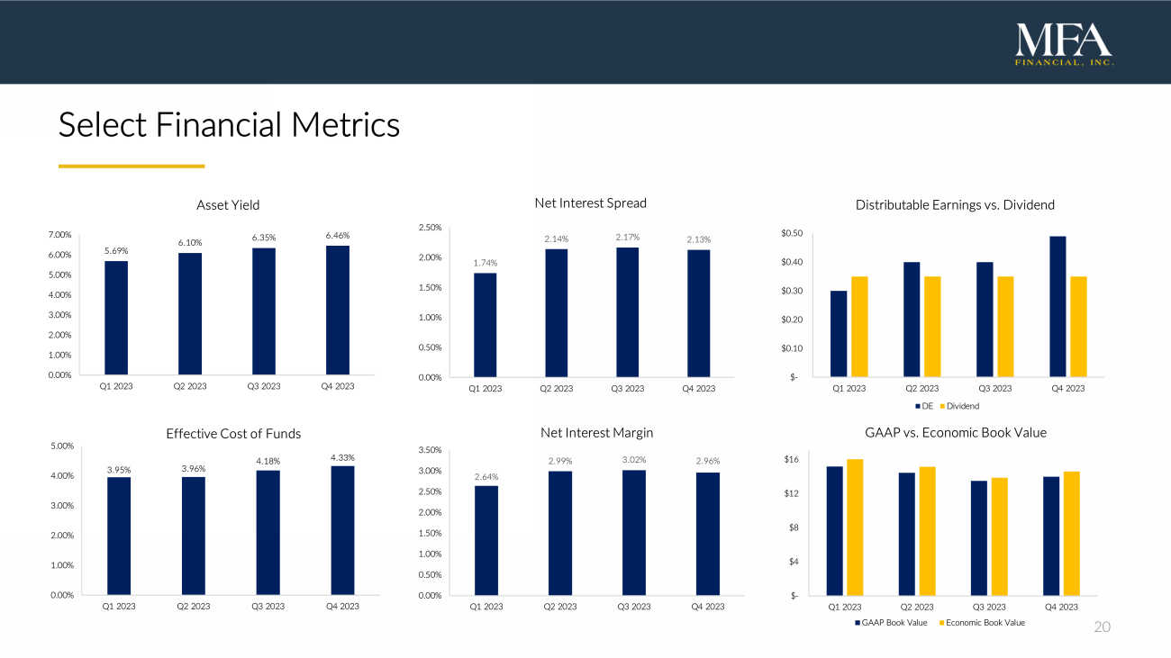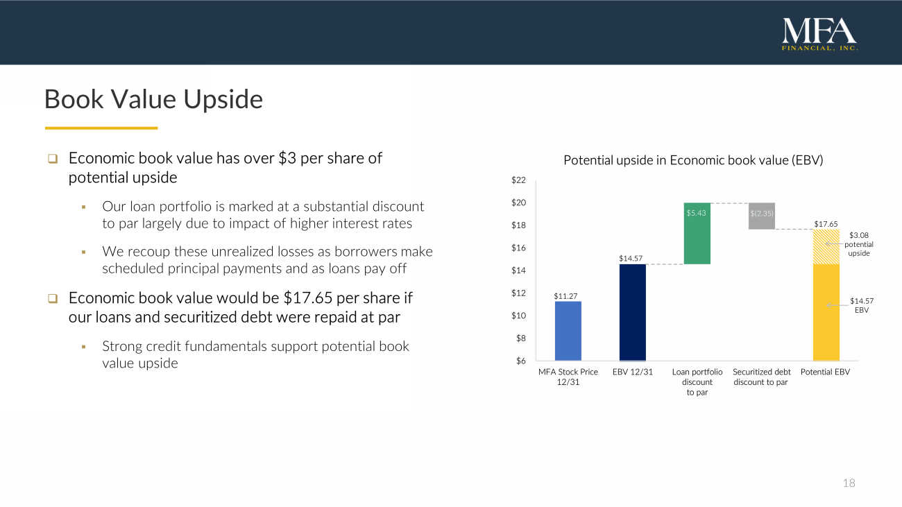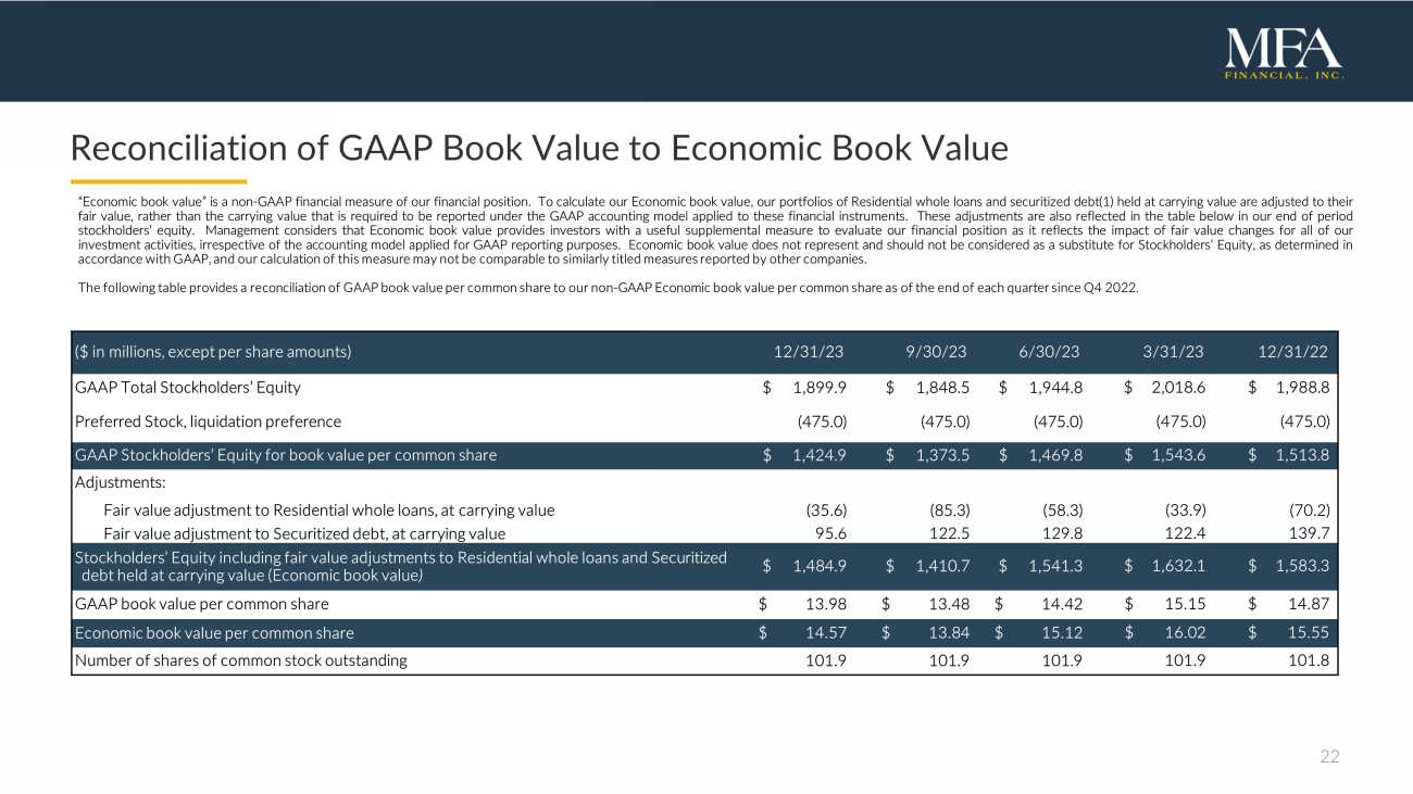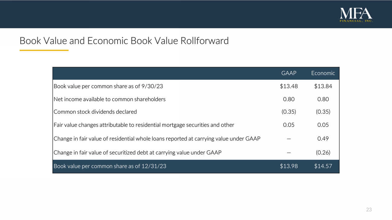 22 Reconciliation of GAAP Book Value to Economic Book Value “Economic book value” is a non - GAAP financial measure of our financial position . To calculate our Economic book value, our portfolios of Residential whole loans and securitized debt( 1 ) held at carrying value are adjusted to their fair value, rather than the carrying value that is required to be reported under the GAAP accounting model applied to these financial instruments . These adjustments are also reflected in the table below in our end of period stockholders’ equity . Management considers that Economic book value provides investors with a useful supplemental measure to evaluate our financial position as it reflects the impact of fair value changes for all of our investment activities, irrespective of the accounting model applied for GAAP reporting purposes . Economic book value does not represent and should not be considered as a substitute for Stockholders’ Equity, as determined in accordance with GAAP, and our calculation of this measure may not be comparable to similarly titled measures reported by other companies . The following table provides a reconciliation of GAAP book value per common share to our non - GAAP Economic book value per common share as of the end of each quarter since Q 4 2022 . ($ i n millions, except per share amounts) 12/31 /2 3 9/30 /2 3 6/30 /2 3 3 /3 1 /2 3 12 /3 1 /22 GAAP Total Stockholders’ Equity $ 1,899.9 $ 1,848.5 $ 1,944.8 $ 2,018.6 $ 1,988.8 Preferred Stock, liquidation preference (475.0) (475.0) (475.0) (475.0 ) (475.0 ) GAAP Stockholders’ Equity for book value per common share $ 1,424.9 $ 1,373.5 $ 1,469.8 $ 1, 543.6 $ 1, 513.8 Adjustments: Fair value adjustment to Residential whole loans, at carrying value (35.6) (85.3) (58.3) (33.9) (70.2) Fair value adjustment to Securitized debt, at carrying value 95.6 122.5 129.8 122.4 139.7 Stockholders’ Equity including fair value adjustments to Residential whole loans and Securitized debt held at carrying value (Economic book value ) $ 1,484.9 $ 1,410.7 $ 1,541.3 $ 1,632.1 $ 1,583.3 GAAP book value per common share $ 13.98 $ 13.48 $ 14.42 $ 15.15 $ 14.87 Economic book value per common share $ 14.57 $ 13.84 $ 15.12 $ 16.02 $ 15.55 Number of shares of common stock outstanding 101.9 101.9 101.9 101. 9 101.8