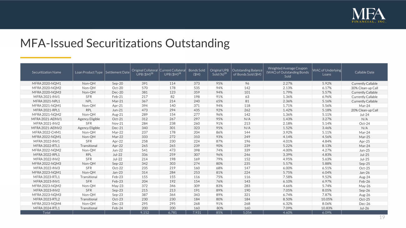 19 MFA - Issued Securitizations Outstanding Securitization Name Loan Product Type Settlement Date Original Collateral UPB ($M) 28 Current Collateral UPB ($M) 28 Bonds Sold ($M) Original UPB Sold (%) 29 Outstanding Balance of Bonds Sold ($M) Weighted Average Coupon (WAC) of Outstanding Bonds Sold WAC of Underlying Loans Callable Date MFRA 2020 - NQM1 Non - QM Sep - 20 391 114 373 95% 96 2.27% 5.92% Currently Callable MFRA 2020 - NQM2 Non - QM Oct - 20 570 178 535 94% 142 2.13% 6.17% 30% Clean - up Call MFRA 2020 - NQM3 Non - QM Dec - 20 381 123 359 94% 101 1.79% 5.57% Currently Callable MFRA 2021 - INV1 SFR Feb - 21 217 82 198 91% 63 1.36% 6.96% Currently Callable MFRA 2021 - NPL1 NPL Mar - 21 367 214 240 65% 81 2.36% 5.16% Currently Callable MFRA 2021 - NQM1 Non - QM Apr - 21 394 140 371 94% 118 1.71% 5.56% Mar - 24 MFRA 2021 - RPL1 RPL Jun - 21 473 294 435 92% 262 1.42% 5.18% 20% Clean - up Call MFRA 2021 - NQM2 Non - QM Aug - 21 289 154 277 96% 142 1.36% 5.11% Jul - 24 MFRA 2021 - AEINV1 Agency Eligible Oct - 21 312 267 297 95% N/A 1.43% 3.27% N/A MFRA 2021 - INV2 SFR Nov - 21 284 238 260 91% 213 2.18% 5.14% Oct - 24 MFRA 2021 - AEINV2 Agency Eligible Dec - 21 340 301 323 95% N/A 1.52% 3.46% N/A MFRA 2022 - CHM1 Non - QM Mar - 22 237 178 204 86% 144 3.92% 5.11% Mar - 24 MFRA 2022 - NQM1 Non - QM Mar - 22 333 272 310 93% 249 4.14% 4.56% Mar - 25 MFRA 2022 - INV1 SFR Apr - 22 258 230 224 87% 196 4.01% 4.84% Apr - 25 MFRA 2022 - RTL1 Transitional Apr - 22 265 265 239 90% 239 5.22% 8.13% Mar - 24 MFRA 2022 - NQM2 Non - QM Jun - 22 541 473 398 74% 339 4.00% 4.27% Jun - 25 MFRA 2022 - RPL1 RPL Jul - 22 336 259 307 96% 246 3.39% 4.83% Jul - 25 MFRA 2022 - INV2 SFR Jul - 22 214 198 169 79% 152 4.95% 5.63% Jul - 25 MFRA 2022 - NQM3 Non - QM Sep - 22 342 303 274 80% 235 5.57% 5.88% Sep - 25 MFRA 2022 - INV3 SFR Oct - 22 235 219 160 68% 147 6.00% 6.51% Oct - 25 MFRA 2023 - NQM1 Non - QM Jan - 23 314 284 253 81% 224 5.75% 6.04% Jan - 26 MFRA 2023 - RTL1 Transitional Feb - 23 155 155 116 75% 116 7.58% 9.52% Aug - 24 MFRA 2023 - INV1 SFR Feb - 23 204 192 154 76% 143 6.10% 6.97% Feb - 26 MFRA 2023 - NQM2 Non - QM May - 23 372 346 309 83% 283 4.66% 5.74% May - 26 MFRA 2023 - INV2 SFR Sep - 23 215 213 191 89% 190 7.05% 8.05% Sep - 26 MFRA 2023 - NQM3 Non - QM Sep - 23 387 364 343 89% 321 6.74% 7.87% Aug - 26 MFRA 2023 - RTL2 Transitional Oct - 23 230 230 184 80% 184 8.50% 10.05% Oct - 25 MFRA 2023 - NQM4 Non - QM Dec - 23 295 295 268 91% 268 6.32% 8.06% Dec - 26 MFRA 2024 - RTL1 Transitional Feb - 24 200 200 160 80% 160 7.09% 10.83% Jul - 26 Total 9,152 6,781 7,931 85% 5,054 4.60% 6.09%