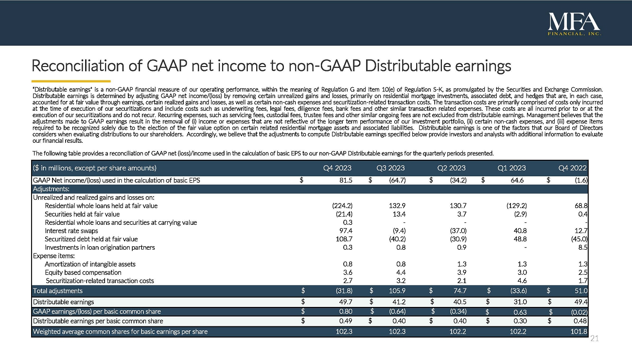 21 Reconciliation of GAAP net income to non - GAAP Distributable earnings “Distributable earnings” is a non - GAAP financial measure of our operating performance, within the meaning of Regulation G and Item 10 (e) of Regulation S - K, as promulgated by the Securities and Exchange Commission . Distributable earnings is determined by adjusting GAAP net income/(loss) by removing certain unrealized gains and losses, primarily on residential mortgage investments, associated debt, and hedges that are, in each case, accounted for at fair value through earnings, certain realized gains and losses, as well as certain non - cash expenses and securitization - related transaction costs . The transaction costs are primarily comprised of costs only incurred at the time of execution of our securitizations and include costs such as underwriting fees, legal fees , diligence fees, bank fees and other similar transaction related expenses . These costs are all incurred prior to or at the execution of our securitizations and do not recur . Recurring expenses, such as servicing fees, custodial fees, trustee fees and other similar ongoing fees are not excluded from distributable earnings . Management believes that the adjustments made to GAAP earnings result in the removal of ( i ) income or expenses that are not reflective of the longer term performance of our investment portfolio, (ii) certain non - cash expenses, and (iii) expense items required to be recognized solely due to the election of the fair value option on certain related residential mortgage assets and associated liabilities . Distributable earnings is one of the factors that our Board of Directors considers when evaluating distributions to our shareholders . Accordingly, we believe that the adjustments to compute Distributable earnings specified below provide investors and analysts with additional information to evaluate our financial results . The following table provides a reconciliation of GAAP net (loss)/income used in the calculation of basic EPS to our non - GAAP Distributable earnings for the quarterly periods presented . ( $ i n m illions, e xcept p er s hare a mounts) Q4 202 3 Q3 202 3 Q 2 202 3 Q 1 202 3 Q 4 2022 GAAP Net income/(loss) used in the calculation of basic EPS $ 81.5 $ (64.7) $ (34.2) $ 64.6 $ (1.6) Adjustments: Unrealized and realized gains and losses on: Residential whole loans held at fair value (224.2) 132.9 130.7 (129.2) 68.8 Securities held at fair value (21.4) 13.4 3.7 (2.9) 0.4 Residential whole loans and securities at carrying value 0.3 - - - - Interest rate swaps 97.4 (9.4) (37.0) 40.8 12.7 Securitized debt held at fair value 108.7 (40.2) (30.9) 48.8 ( 45.0 ) Investments in loan origination partners 0.3 0.8 0.9 - 8.5 Expense items: Amortization of intangible assets 0.8 0.8 1.3 1.3 1.3 Equity based compensation 3.6 4.4 3.9 3.0 2.5 Securitization - related transaction costs 2.7 3.2 2.1 4.6 1.7 Total adjustments $ (31.8) $ 105.9 $ 74.7 $ (33.6) $ 51.0 Distributable earnings $ 49.7 $ 41.2 $ 40.5 $ 31.0 $ 49.4 GAAP earnings/(loss) per basic common share $ 0.80 $ (0.64) $ (0.34) $ 0.63 $ (0.02) Distributable earnings per basic common share $ 0.49 $ 0.40 $ 0.40 $ 0.30 $ 0.48 Weighted average common shares for basic earnings per share 102.3 10 2.3 10 2.2 10 2.2 10 1 . 8