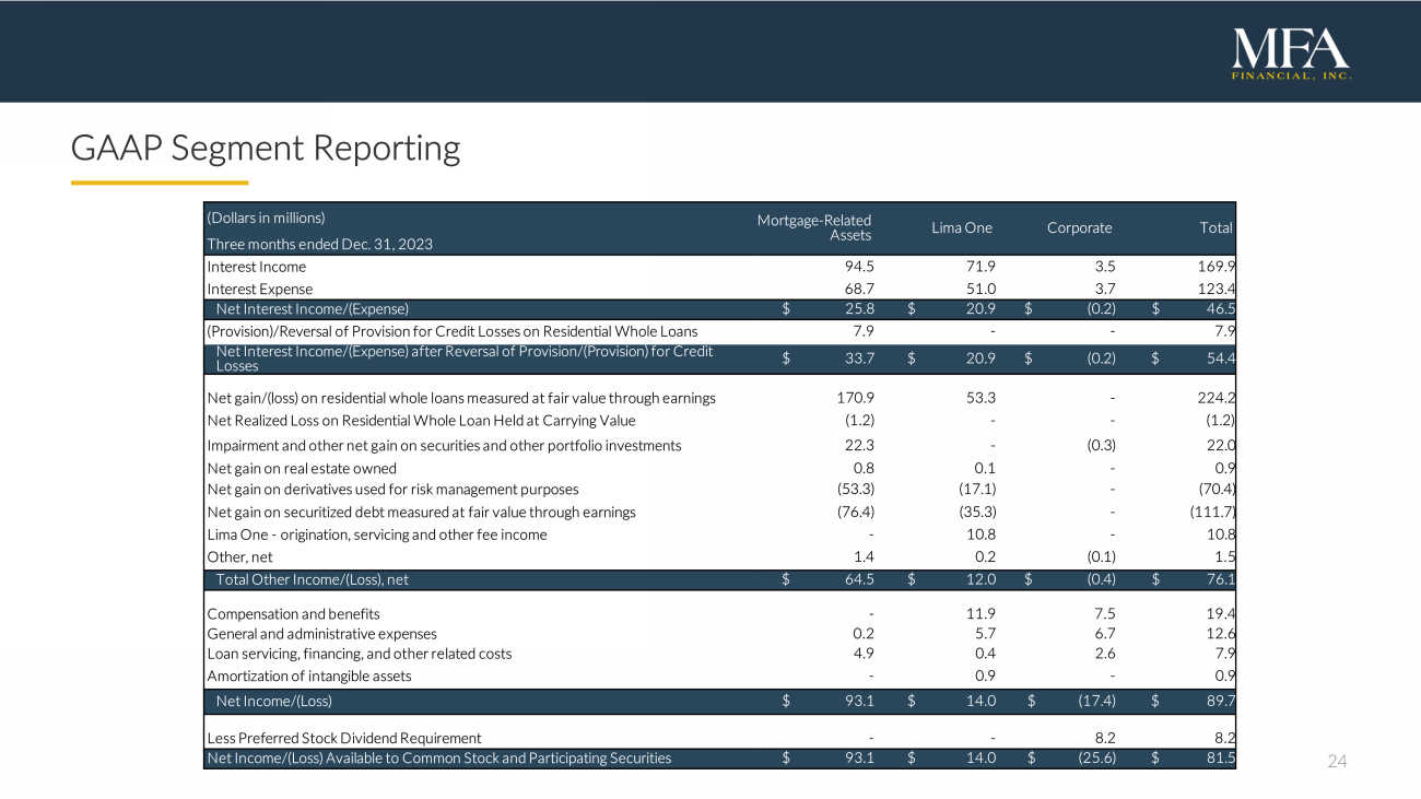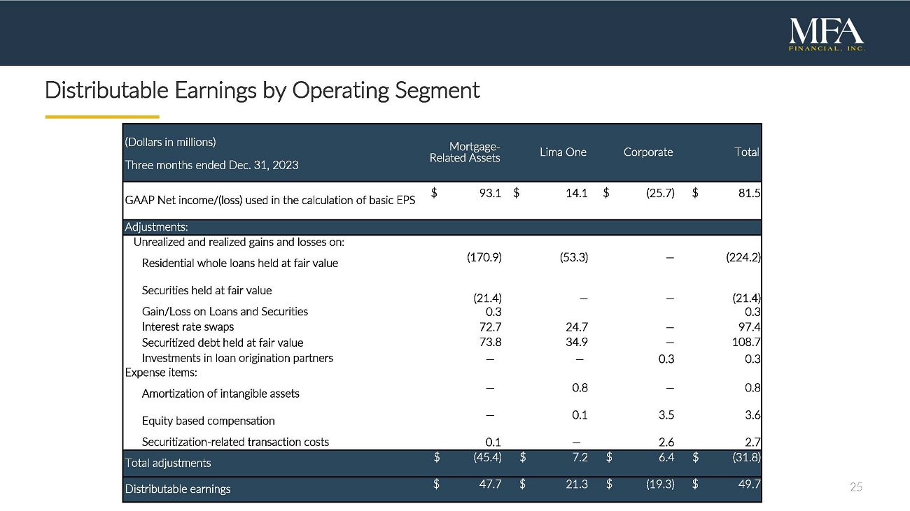 24 GAAP Segment Reporting (Dollars in m illions) Mortgage - Related Assets Lima One Corporate Total Three months ended Dec. 31, 2023 Interest Income 94.5 71.9 3.5 169.9 Interest Expense 68.7 51.0 3.7 123.4 Net Interest Income /(Expense) $ 25.8 $ 20.9 $ (0.2) $ 46.5 (Provision)/Reversal of Provision for Credit Losses on Residential Whole Loans 7.9 - - 7.9 Net Interest Income /(Expense) after Reversal of Provision/( Provision ) for Credit Losses $ 33.7 $ 20.9 $ (0.2) $ 54.4 Net gain/(loss) on residential whole loans measured at fair value through earnings 170.9 53.3 - 224.2 Net Realized Loss on Residential Whole Loan Held at Carrying Value (1.2) - - (1.2) ) Impairment and other net gain on securities and other portfolio investments 22.3 - (0.3) 22.0 Net gain on real estate owned 0.8 0.1 - 0.9 Net gain on derivatives used for risk management purposes (53.3) (17.1) - (70.4) Net gain on securitized debt measured at fair value through earnings (76.4) (35.3) - (111.7) Lima One - origination, servicing and other fee income - 10.8 - 10.8 Other, net 1.4 0.2 (0.1) 1.5 Total Other Income/(Loss) , net $ 64.5 $ 12.0 $ (0.4) $ 76.1 Compensation and benefits - 11.9 7.5 19.4 General and administrative expenses 0.2 5.7 6.7 12.6 Loan servicing, financing, and other related costs 4.9 0.4 2.6 7.9 Amortization of intangible assets - 0.9 - 0.9 Net Income/( Loss ) $ 93.1 $ 14.0 $ (17.4) $ 89.7 Less Preferred Stock Dividend Requirement - - 8.2 8.2 Net Income/( Loss ) Available to Common Stock and Participating Securities $ 93.1 $ 14.0 $ (25.6) $ 81.5
