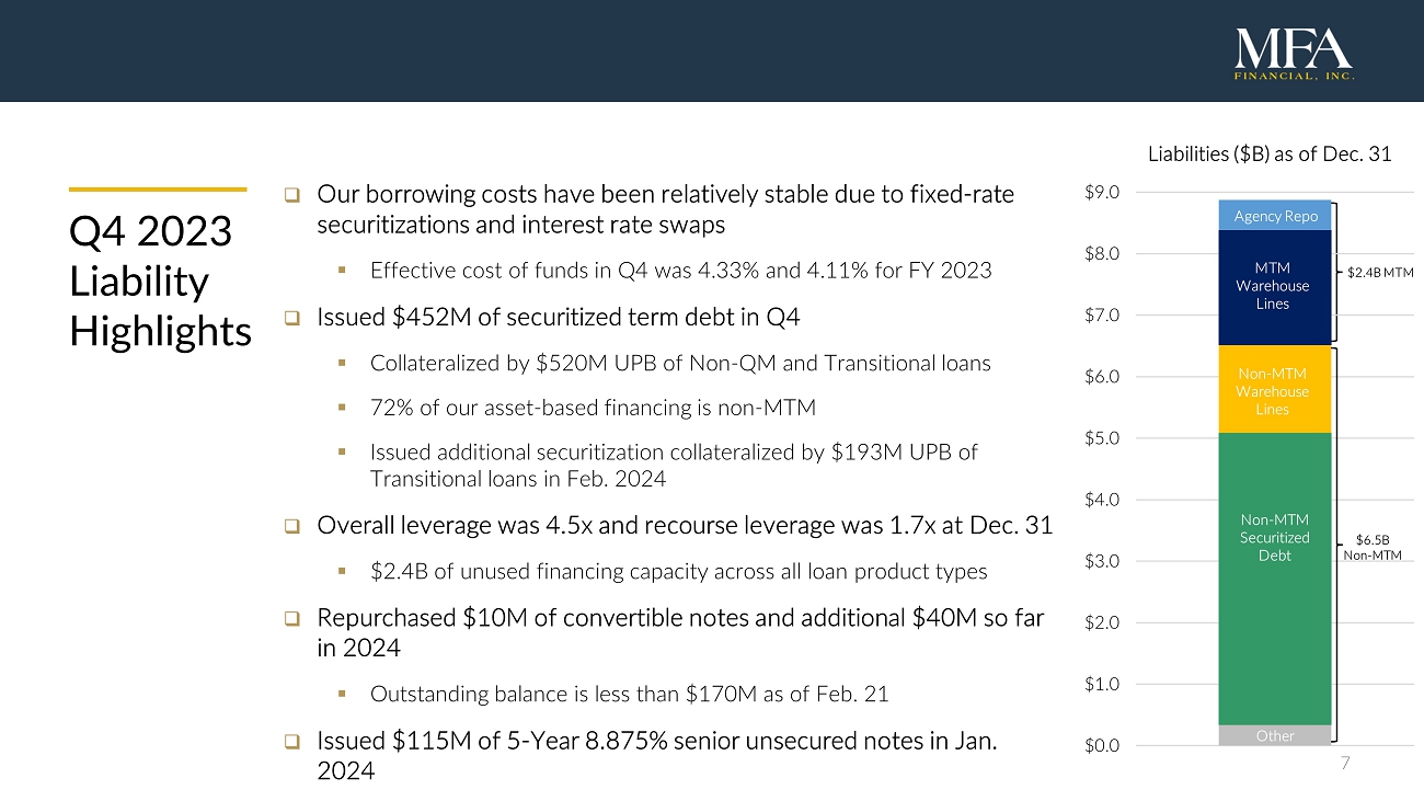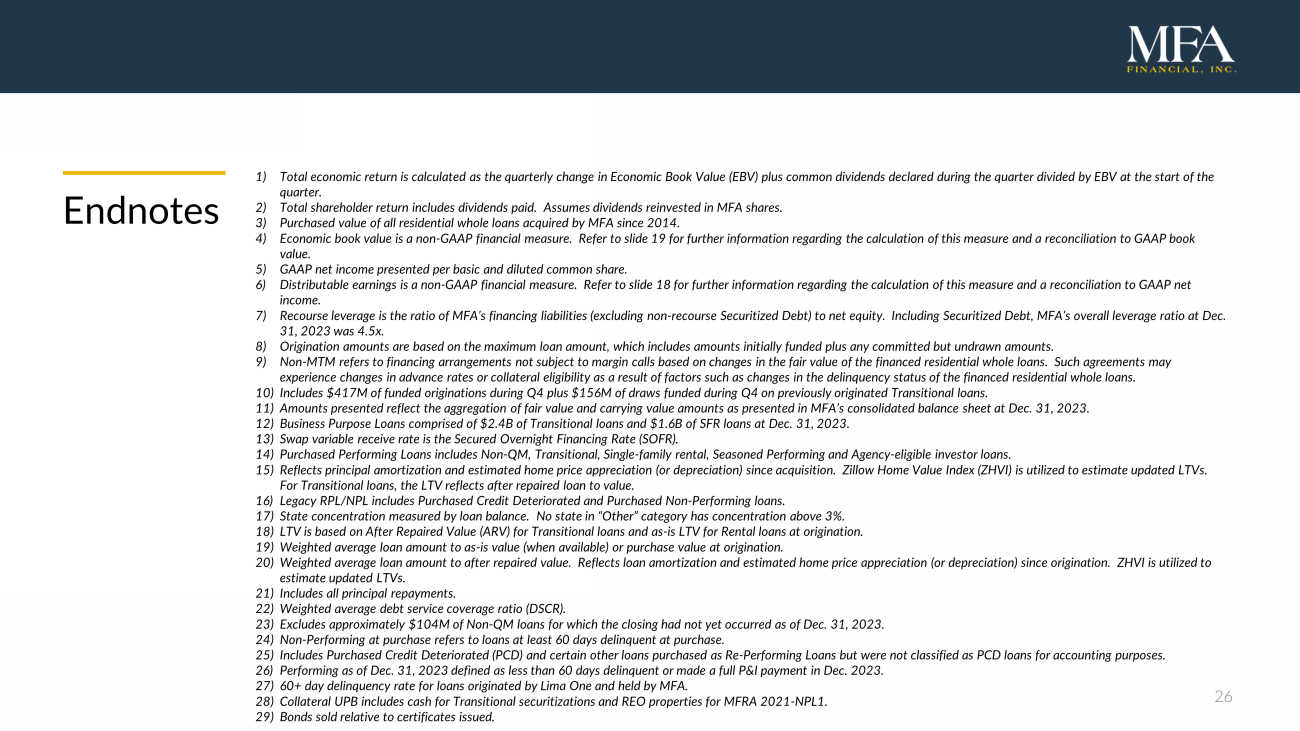 26 Endnotes 1) Total economic return is calculated as the quarterly change in Economic Book Value (EBV) plus common dividends declared durin g t he quarter divided by EBV at the start of the quarter. 2) Total shareholder return includes dividends paid. Assumes dividends reinvested in MFA shares. 3) Purchased value of all residential whole loans acquired by MFA since 2014. 4) Economic book value is a non - GAAP financial measure. Refer to slide 19 for further information regarding the calculation of this measure and a reco nciliation to GAAP book value. 5) GAAP net income presented per basic and diluted common share. 6) Distributable earnings is a non - GAAP financial measure. Refer to slide 18 for further information regarding the calculation of this measure and a reconciliation to GAAP net income. 7) Recourse leverage is the ratio of MFA’s financing liabilities (excluding non - recourse Securitized Debt) to net equity. Includin g Securitized Debt, MFA’s overall leverage ratio at Dec. 31, 2023 was 4.5x. 8) Origination amounts are based on the maximum loan amount, which includes amounts initially funded plus any committed but undr awn amounts. 9) Non - MTM refers to financing arrangements not subject to margin calls based on changes in the fair value of the financed resident ial whole loans. Such agreements may experience changes in advance rates or collateral eligibility as a result of factors such as changes in the delinquency statu s o f the financed residential whole loans. 10) Includes $417M of funded originations during Q4 plus $156M of draws funded during Q4 on previously originated Transitional lo ans . 11) Amounts presented reflect the aggregation of fair value and carrying value amounts as presented in MFA’s consolidated balance sh eet at Dec. 31, 2023. 12) Business Purpose Loans comprised of $2.4B of Transitional loans and $1.6B of SFR loans at Dec. 31, 2023. 13) Swap variable receive rate is the Secured Overnight Financing Rate (SOFR). 14) Purchased Performing Loans includes Non - QM, Transitional, Single - family rental, Seasoned Performing and Agency - eligible investor loans. 15) Reflects principal amortization and estimated home price appreciation (or depreciation) since acquisition. Zillow Home Value In dex (ZHVI) is utilized to estimate updated LTVs. For Transitional loans, the LTV reflects after repaired loan to value. 16) Legacy RPL/NPL includes Purchased Credit Deteriorated and Purchased Non - Performing loans. 17) State concentration measured by loan balance. No state in “Other” category has concentration above 3%. 18) LTV is based on After Repaired Value (ARV) for Transitional loans and as - is LTV for Rental loans at origination. 19) Weighted average loan amount to as - is value (when available) or purchase value at origination. 20) Weighted average loan amount to after repaired value. Reflects loan amortization and estimated home price appreciation (or d epr eciation) since origination. ZHVI is utilized to estimate updated LTVs. 21) Includes all principal repayments. 22) Weighted average debt service coverage ratio (DSCR). 23) Excludes approximately $104M of Non - QM loans for which the closing had not yet occurred as of Dec. 31, 2023. 24) Non - Performing at purchase refers to loans at least 60 days delinquent at purchase. 25) Includes Purchased Credit Deteriorated (PCD) and certain other loans purchased as Re - Performing Loans but were not classified as PCD loans for accounting purposes. 26) Performing as of Dec. 31, 2023 defined as less than 60 days delinquent or made a full P&I payment in Dec. 2023. 27) 60+ day delinquency rate for loans originated by Lima One and held by MFA. 28) Collateral UPB includes cash for Transitional securitizations and REO properties for MFRA 2021 - NPL1. 29) Bonds sold relative to certificates issued.