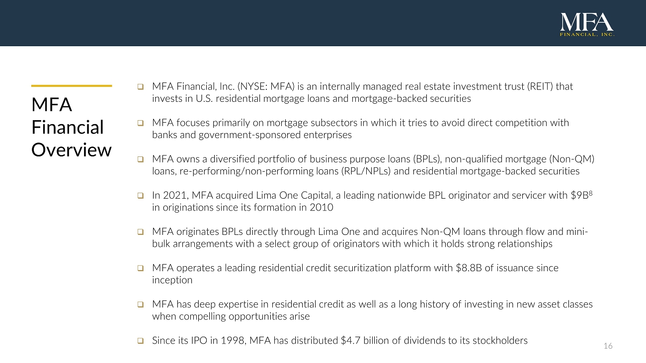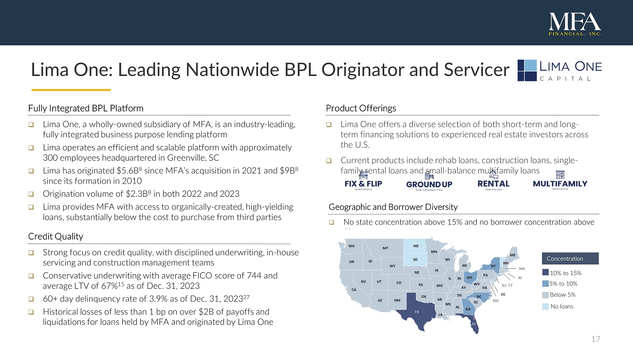 16 MFA Financial Overview □ MFA Financial, Inc. (NYSE: MFA) is an internally managed real estate investment trust (REIT) that invests in U.S. residential mortgage loans and mortgage - backed securities □ MFA focuses primarily on mortgage subsectors in which it tries to avoid direct competition with banks and government - sponsored enterprises □ MFA owns a diversified portfolio of business purpose loans (BPLs), non - qualified mortgage (Non - QM) loans, re - performing/non - performing loans (RPL/NPLs) and residential mortgage - backed securities □ In 2021, MFA acquired Lima One Capital, a leading nationwide BPL originator and servicer with $9B 8 in originations since its formation in 2011 □ MFA originates BPLs directly through Lima One and acquires Non - QM loans through flow and mini - bulk arrangements with a select group of originators with which it holds strong relationships □ MFA operates a leading residential credit securitization platform with $8.8B of issuance since inception □ MFA has deep expertise in residential credit as well as a long history of investing in new asset classes when compelling opportunities arise □ Since its IPO in 1998, MFA has distributed $4.7 billion of dividends to its stockholders